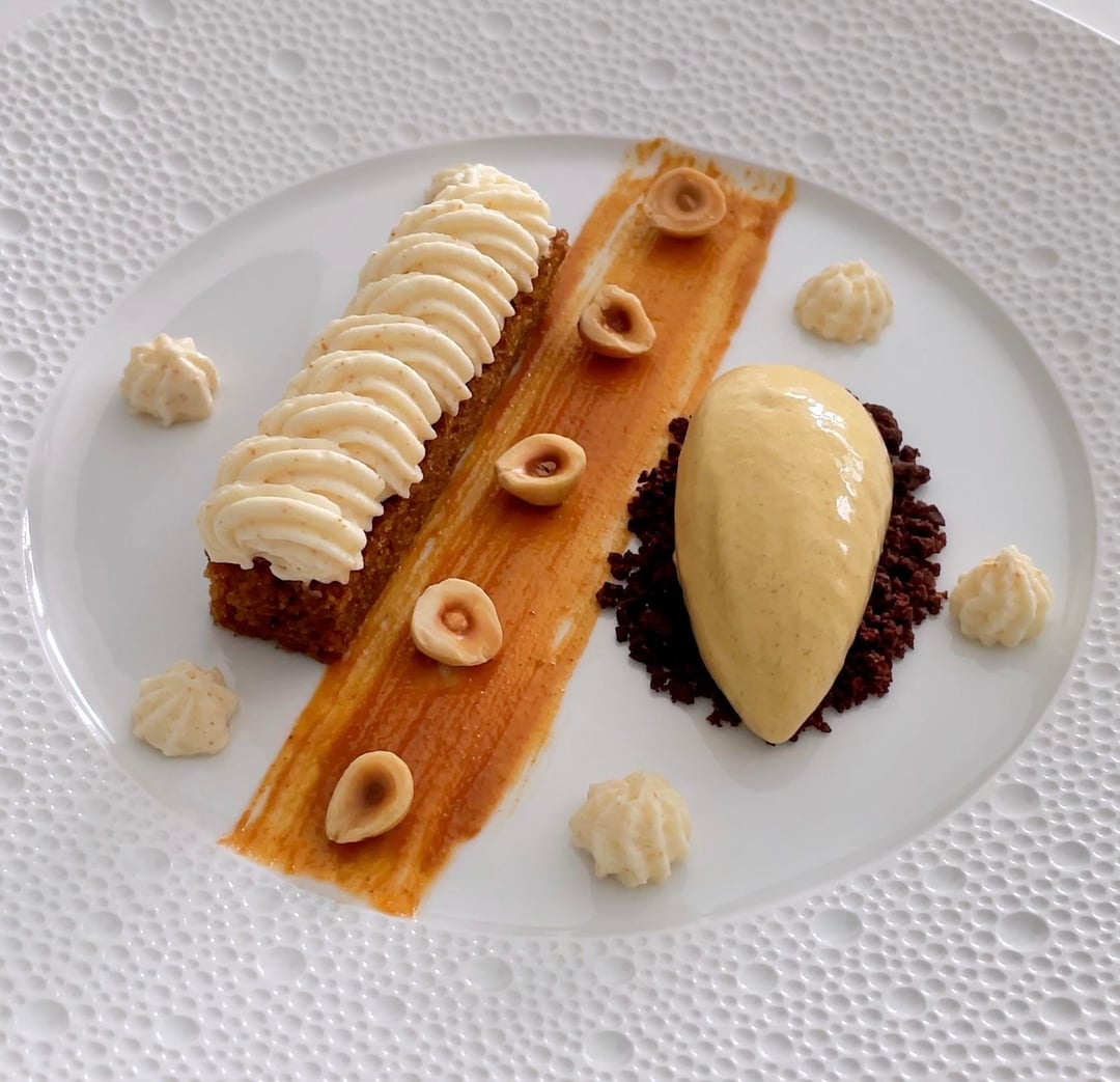 Left side: Pumpkin Cake topped with Brown Butter Cream Cheese Frosting Center: Hazelnut Praline & Roasted Hazelnuts Right side: Pumpkin Spice Ice Cream & Cocoa Crumble by Hai_Cooking Culinary Culinary Plating