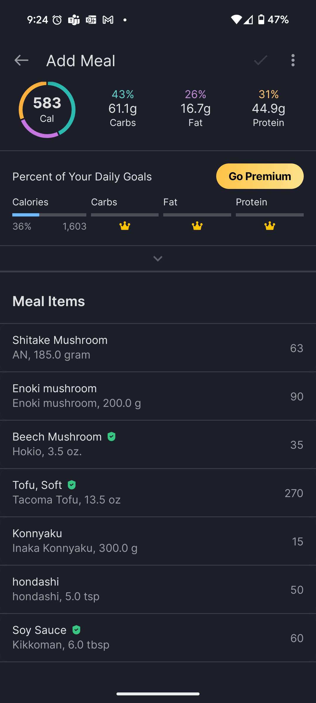 Hondashi and soy sauce is just fine for the broth, and the last screenshot has the ratio I like best. You can ignore the grams, macros, and brands since most of them I randomly chose just to get calories counted.