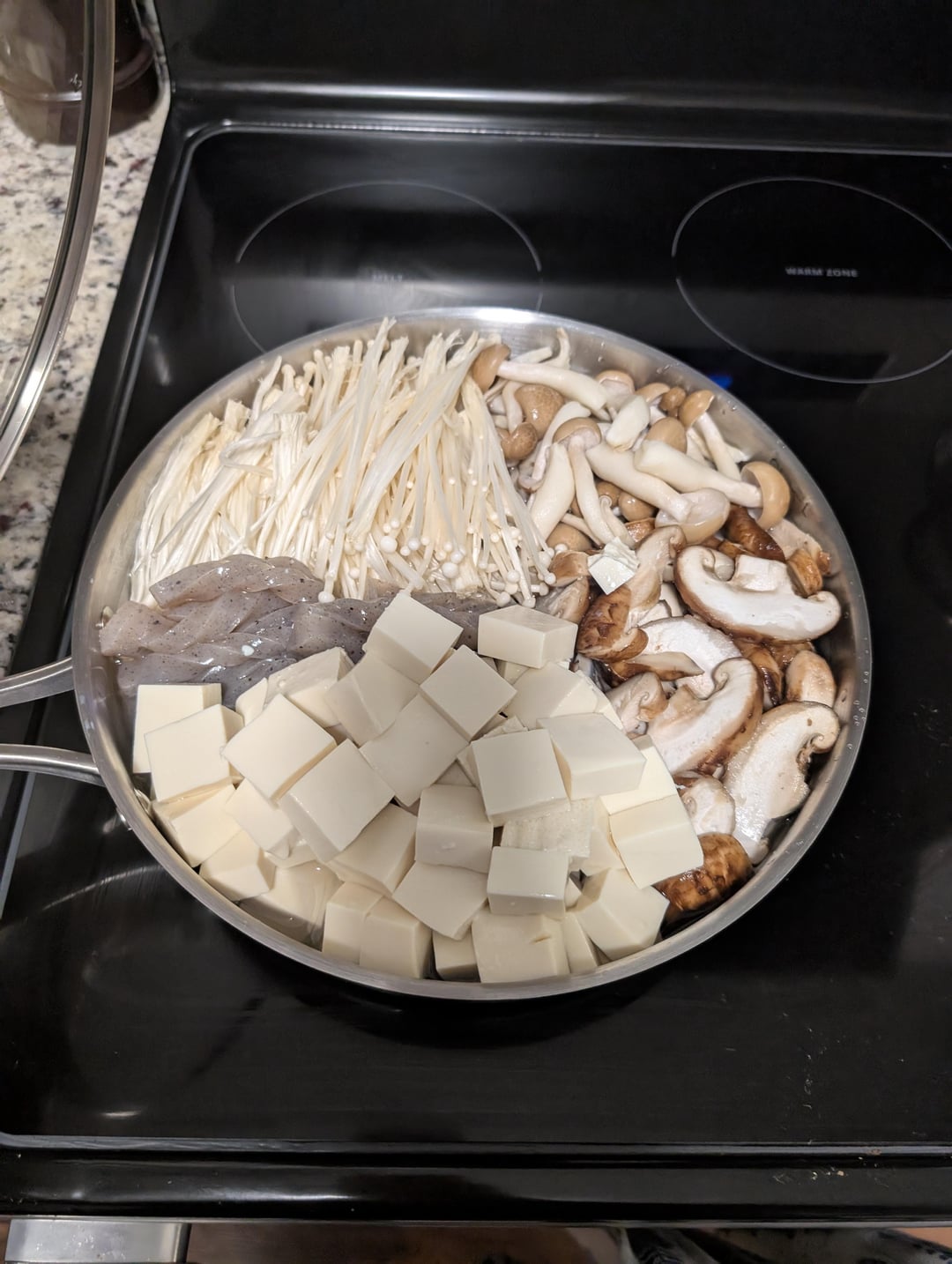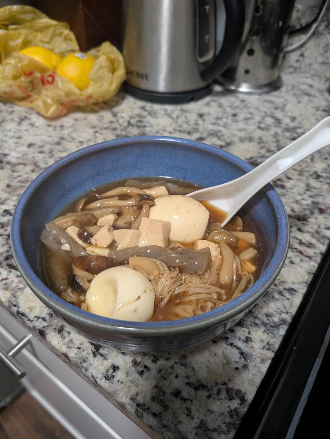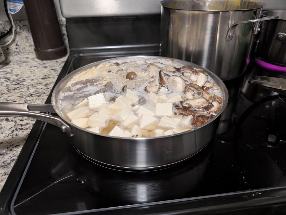 Basically, just take a bunch of cheap mushrooms from the Asian grocery store + tofu + konnyaku (15 cal for a whole block, bro…) + and boil eggs if you want them (which didn't go into the total 583 calculation)