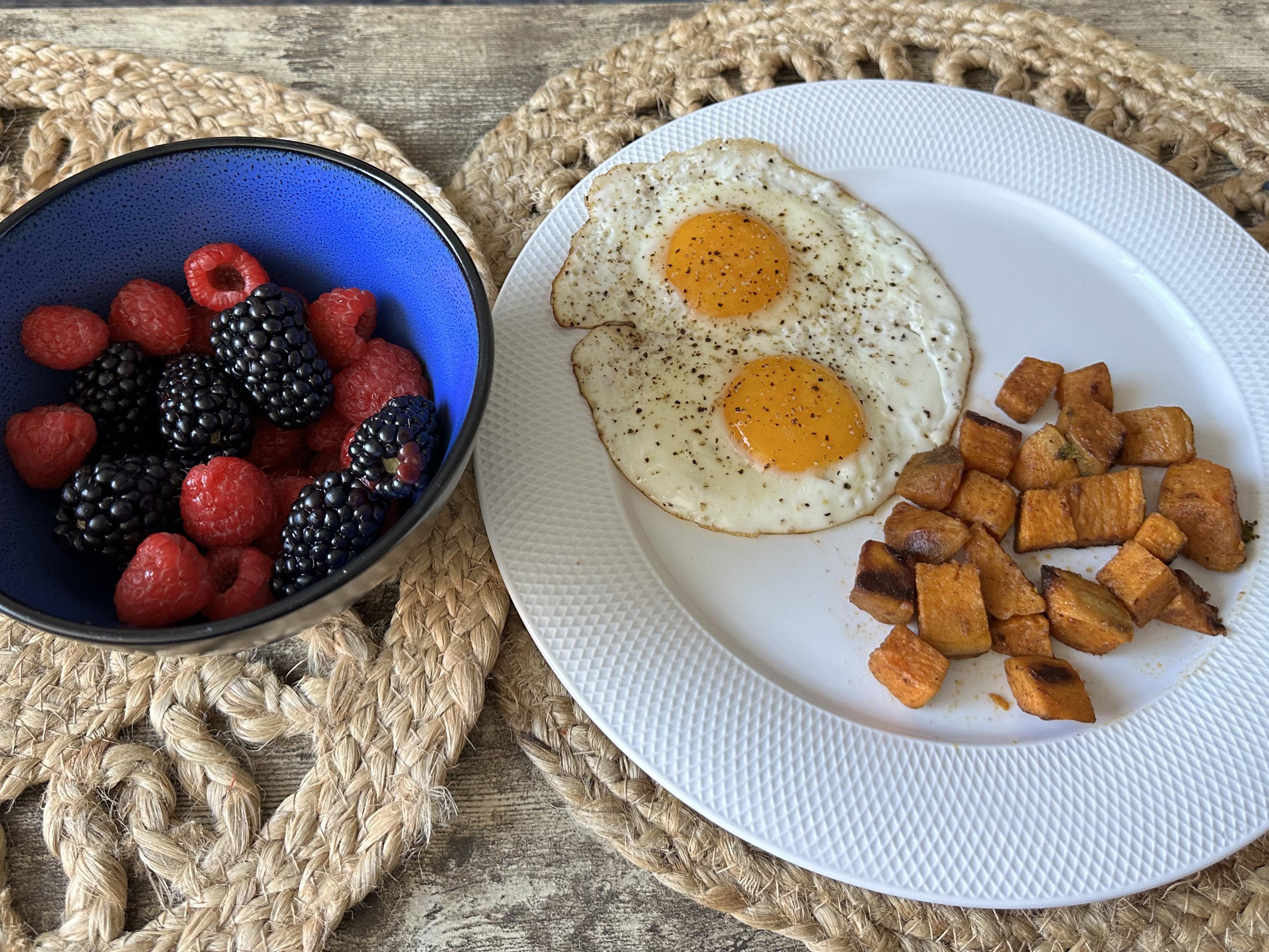 Can you break down how you got to 370 calories? I’ve been struggling lately, and I think it may be me not counting right if that is accurate. I get 65 cals for a cup of berries, 140 for two large eggs and 60 for half a cup of sweet potato? cubes. That adds up to 265, unless you used like a whole tbs of oil or I’m missing something important (and likely making the same mistake over and over for myself).