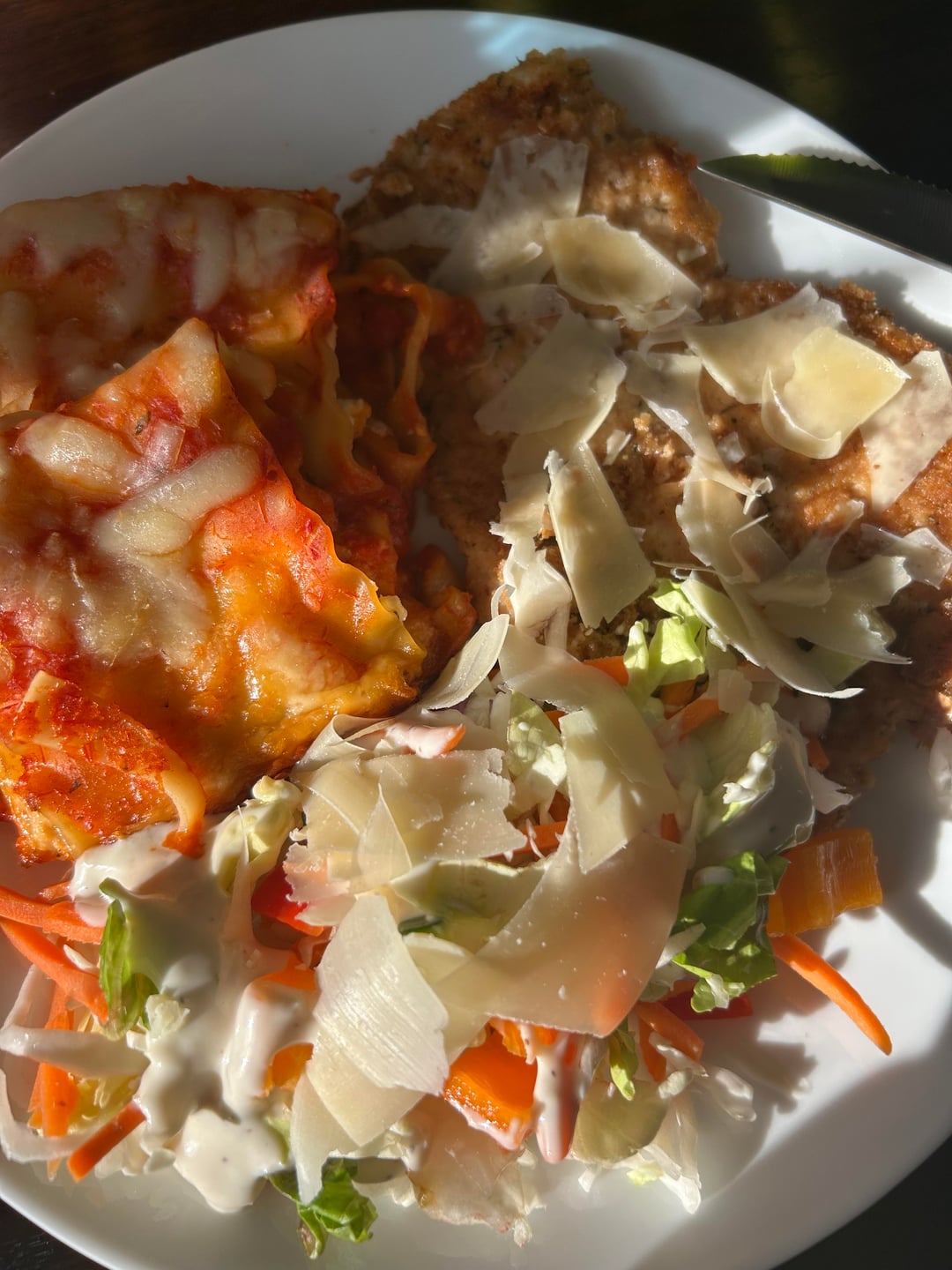 Pork Milanese with a Warm Pappardelle and Courgette Tomato Salad. Finished with Mozarella, Pine Nuts and Basil. Lemon Anchovy Dressing 😊