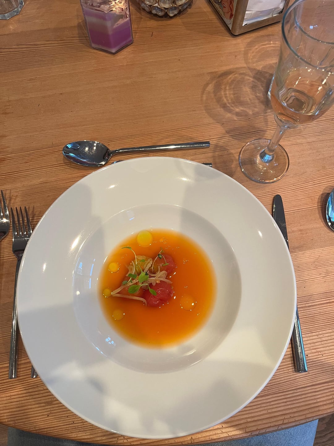 3. A very pretty dish, and here you are still shitting sprouts and microgreens on everything. In this one particular case, micro cilantro or micro basil is quite excusable. Otherwise, I feel like this at least looks like a successful dish – modulo the fact that I never put whole tomatoes in a dish because the textural pop of eating them can be unpleasant for some people. I also don’t get point of pickling something that you’re already putting in what should be a sour broth. You want to build up some contrast here. Why not just leave the tomatoes fresh, cut them in half, marinate them in your basil oil with a bit of salt for a few hours and lean into their sweetness as a way to balance the broth.
