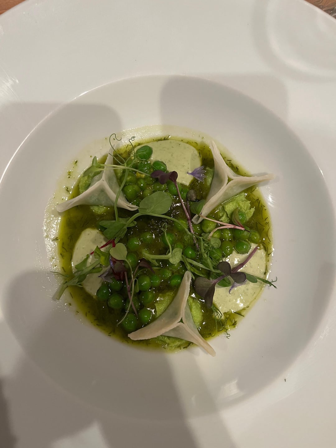- Peas, dill vinaigrette, watercress mayonnaise, kohlrabi, and pea pockets