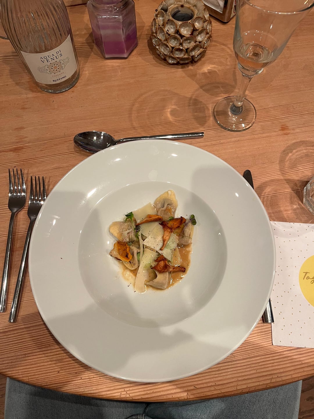 - Porcini mushrooms, tortellini with fermented garlic and onions, mushroom beurre blanc, chanterelles, Parmesan