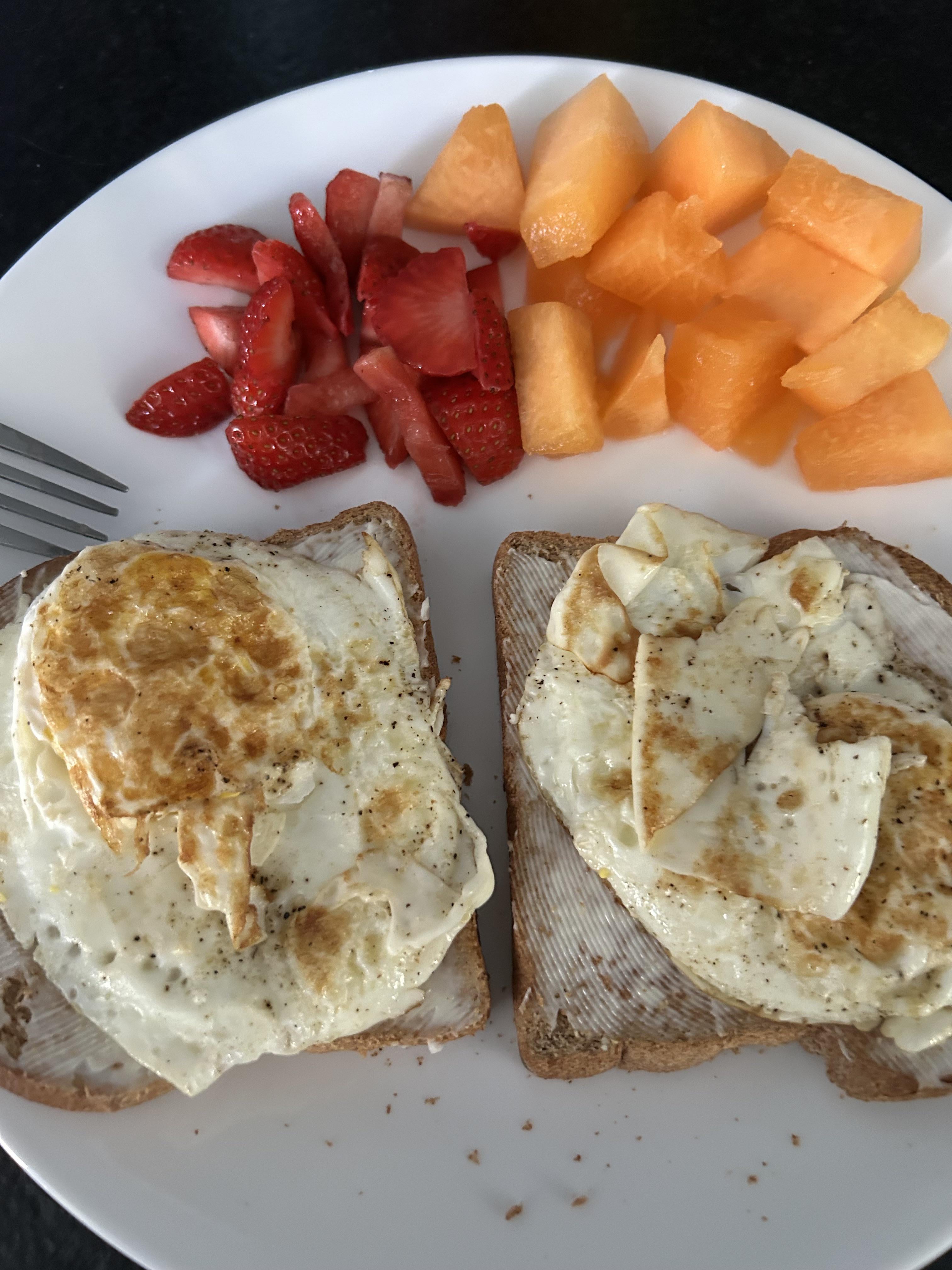 Brunch on an untracked/no measure day – two eggs, toast, laughing cow wedge, and fruit
