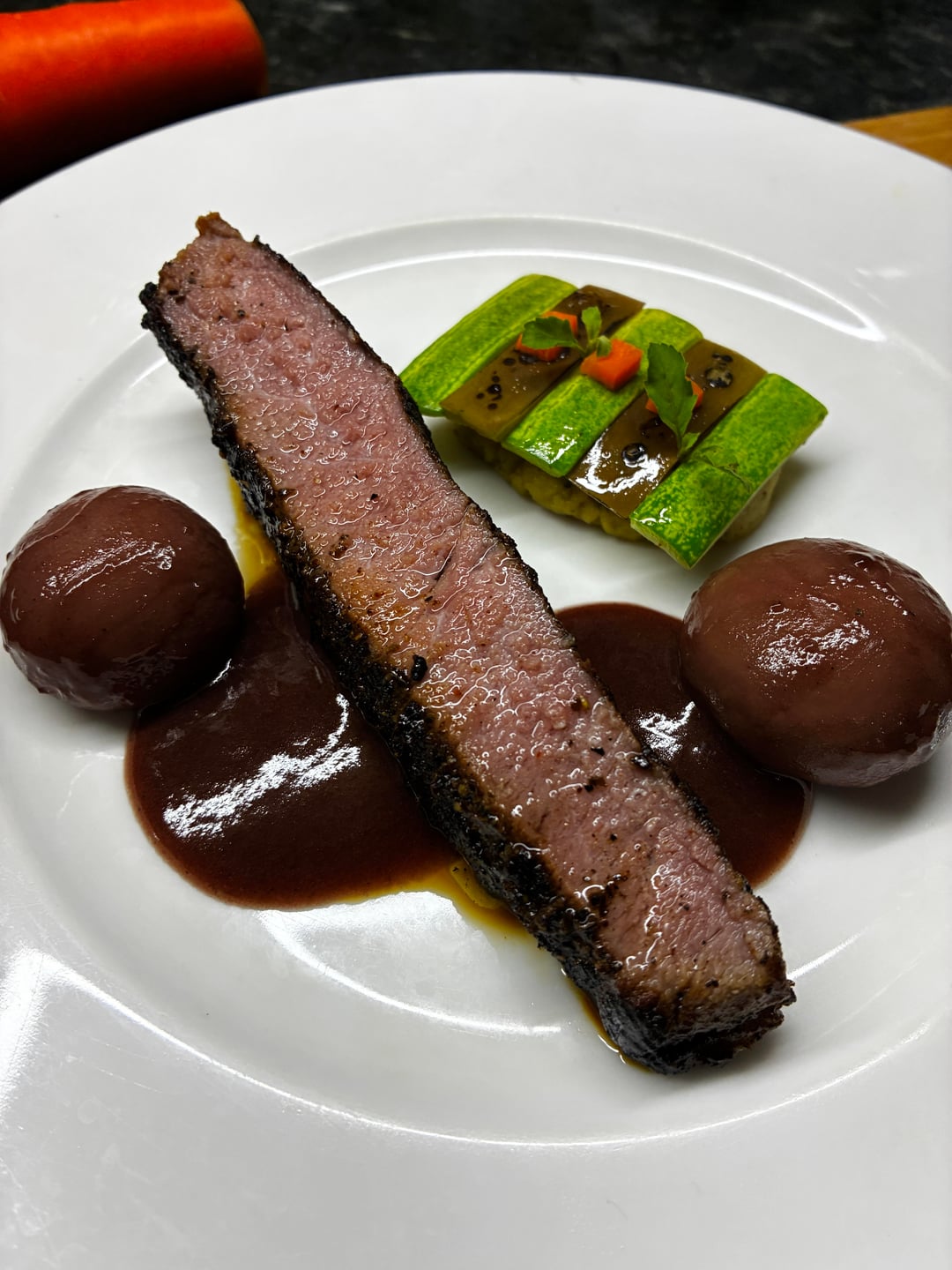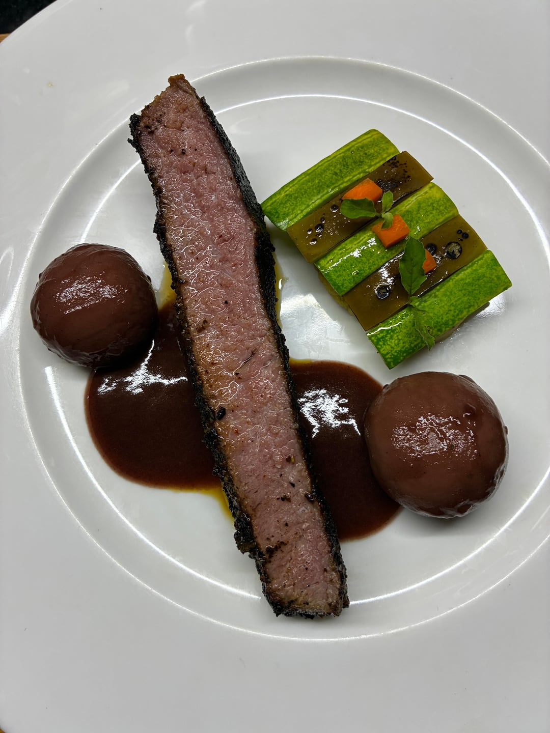 That’s a very odd presentation of a “steak”. The mushrooms sound nice, but should be sliced so they do not look like two brown blobs on the plate. If you are set on that cut and portion of steak, it should also be sliced. The cucumber/eggplant element looks interesting, but perhaps make it more than just that one section. Cut it in half on a bias and placed on more than one section of the plate. Drizzling some of the glaze over the protein would be attractive as well. Not so much as to hide the cook of it, but to break up how monotone it is. Your truffle “puree” appears to be more of a gremolata texture. Actually making a classic gremolata and incorporating the truffle into that may incorporate color and freshness into the dish and could be attractive in dots or schmears on the plate.