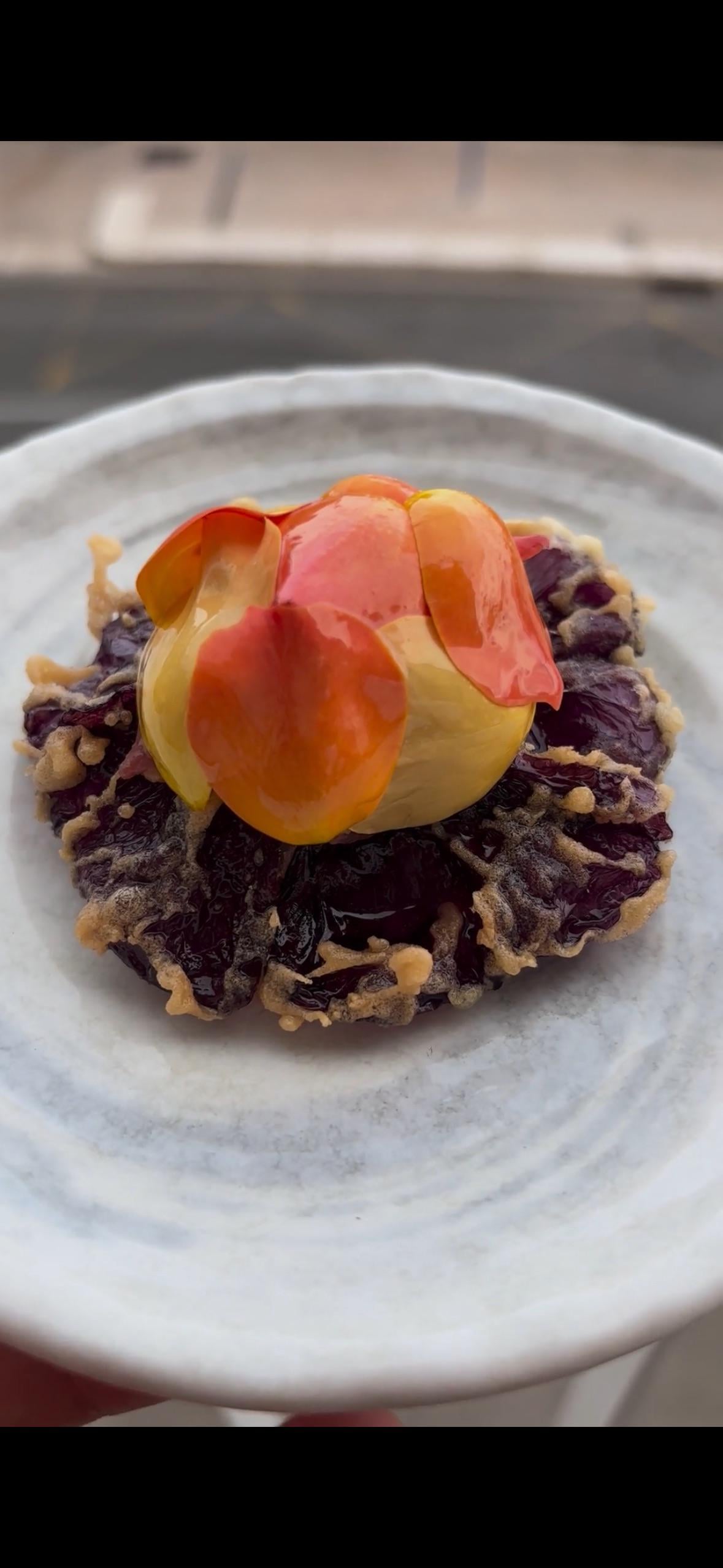A flower “hollyhock” Alcea setosa, is fried in tempura batter. After finished cooking onion confit is placed in the center on top of the pollen, and then finally the beef tartare, which is tartare seasoned with lemon, rose oil, and salt. And finally rose petals are brushed with rose oil and placed over the top.