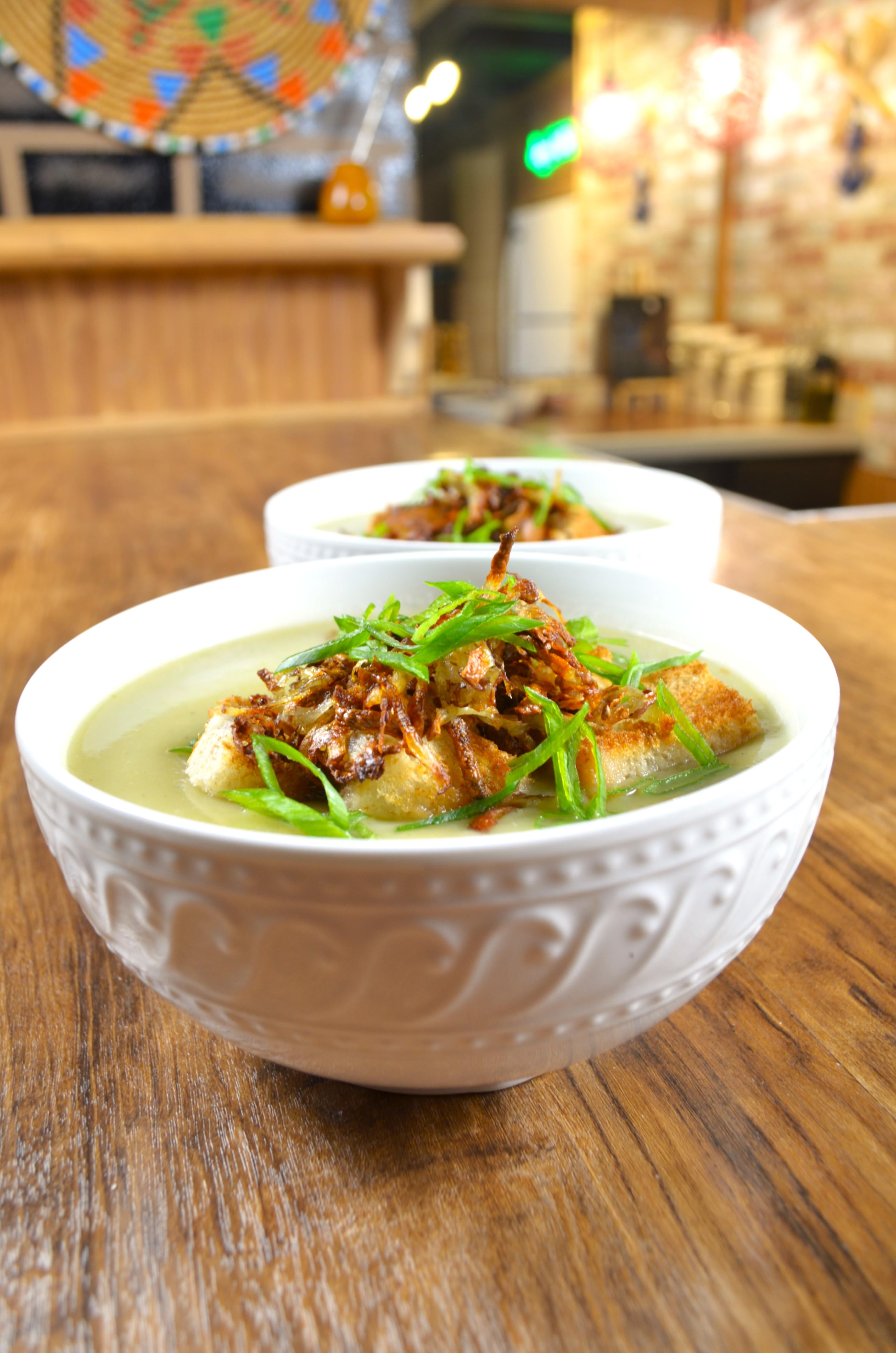 6. Serve: Ladle into bowls, then top with croutons, crispy shredded potato, and a sprinkle of minced green onion.