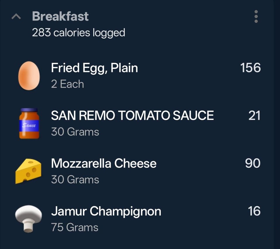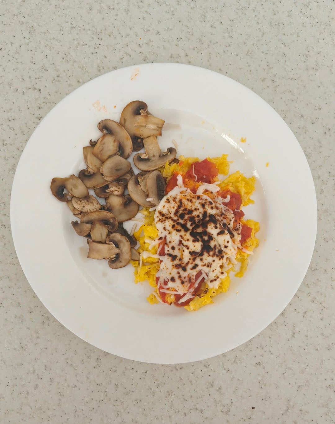 2 Egg, 30g mozarella, tomato pasta sauce, mushrooms on the side