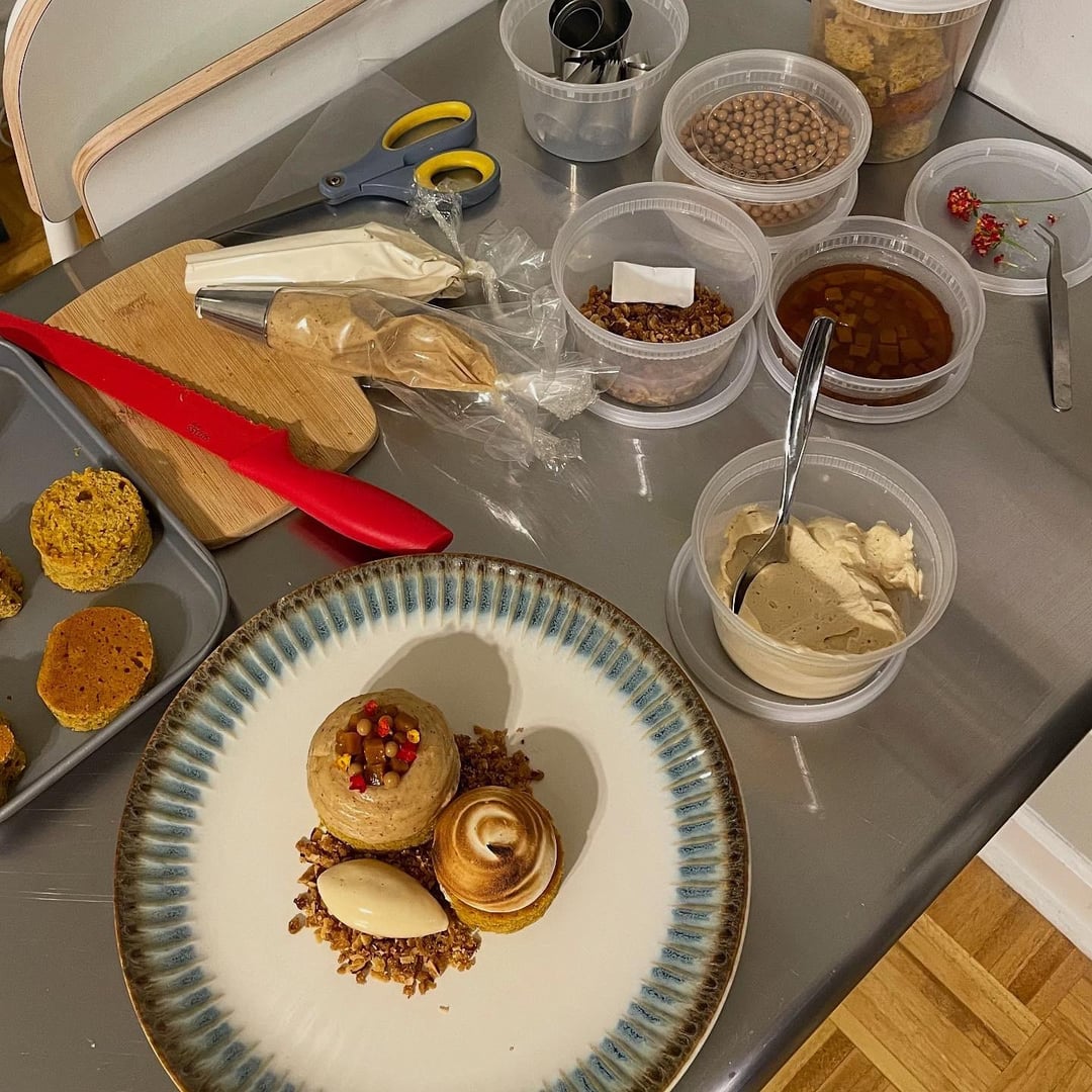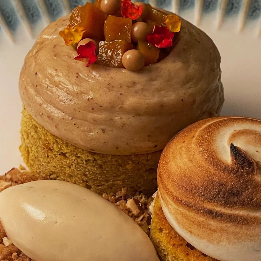 +1 on the nice plate. That said, this is an awful lot of brown and what I assume is the cremeux looks a tiny bit like, um, a turd. I’m sure this is super delicious but it’s busy and there’s just a whole lot more going on than there needs to be. It feels like two desserts plated together.