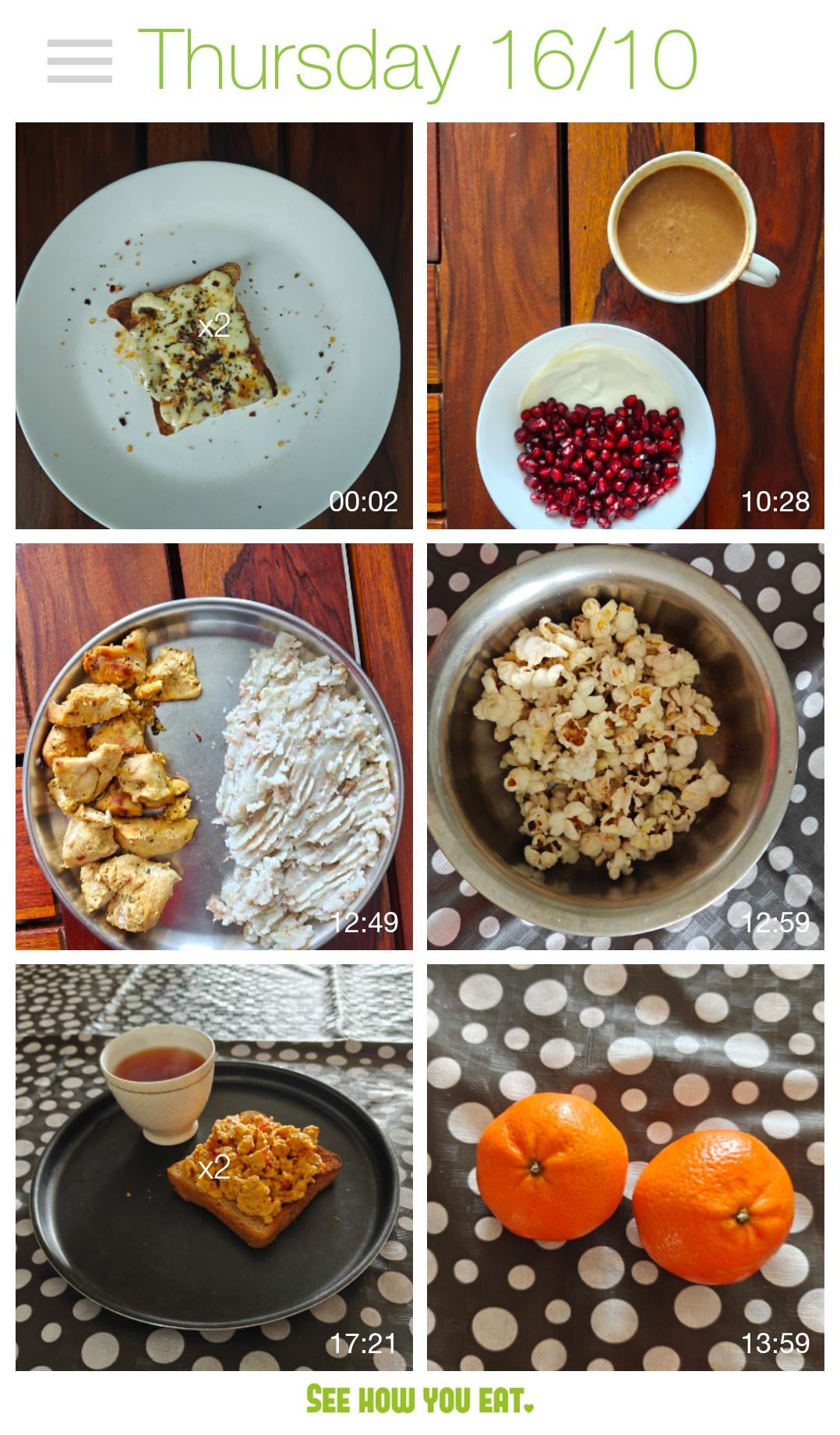 - Dinner: Bread and eggs + 10g cheese + marinara and tomato: 315 kcal: 23P: 4.5Fi
