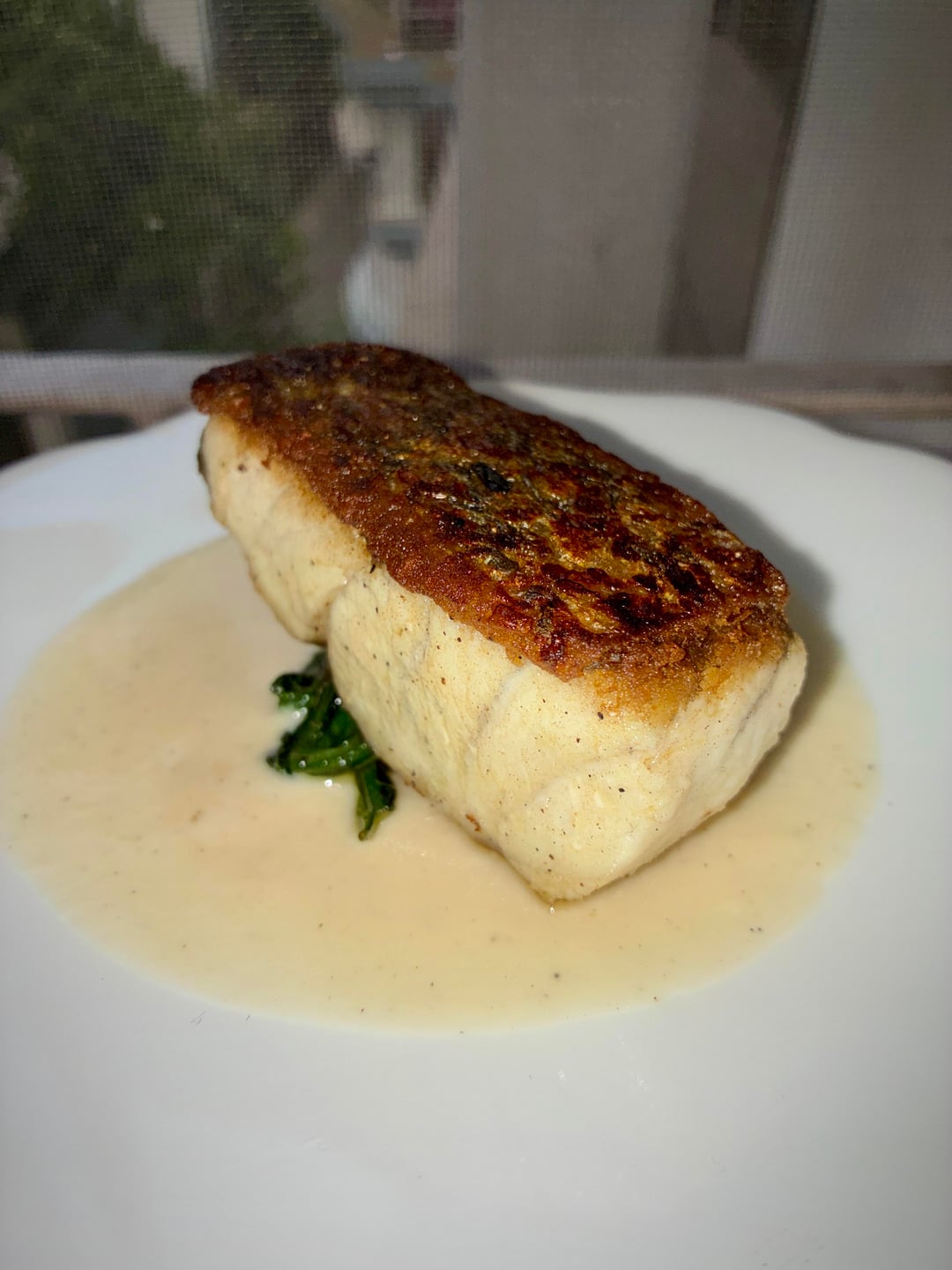 Love the sear. White fish on white sauce…..maybe get some color going? More textures to help the crispy-ness of this fish come out?