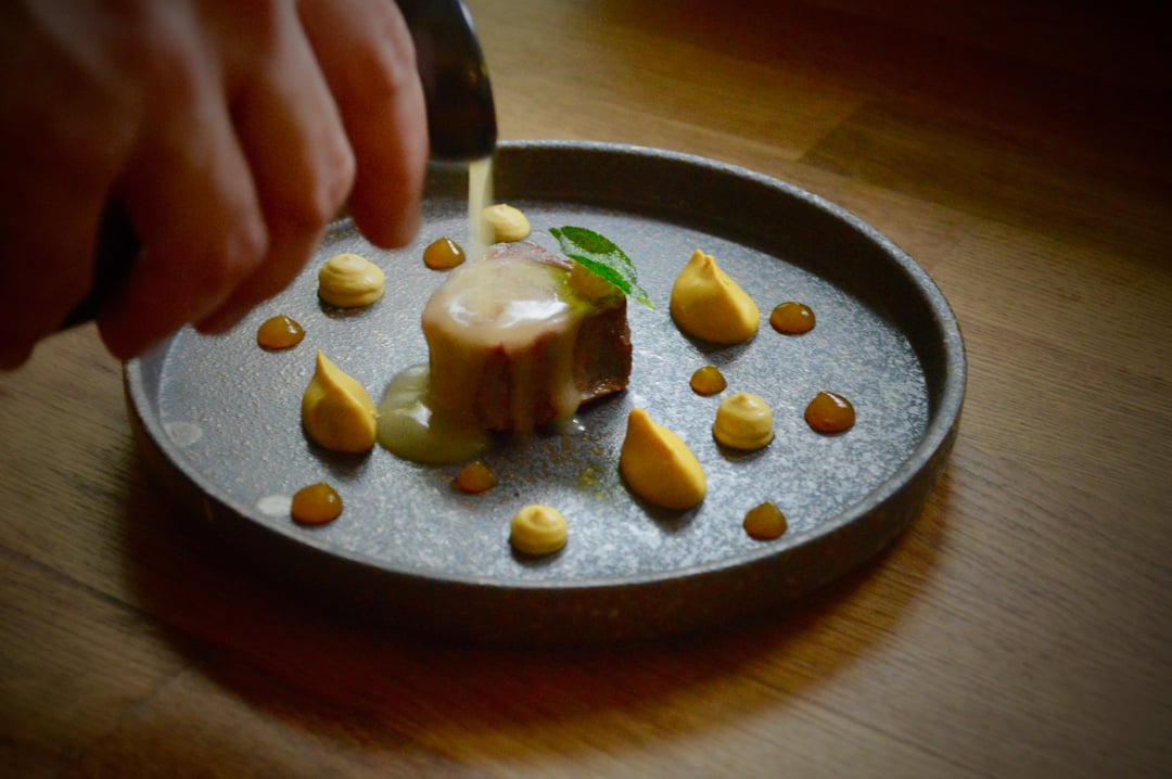 Iberico Presa, Yellow Romesco, Kuri Pumpkin, Persimmon Jam, Albariño by SpeakEasyChef Culinary Culinary Plating