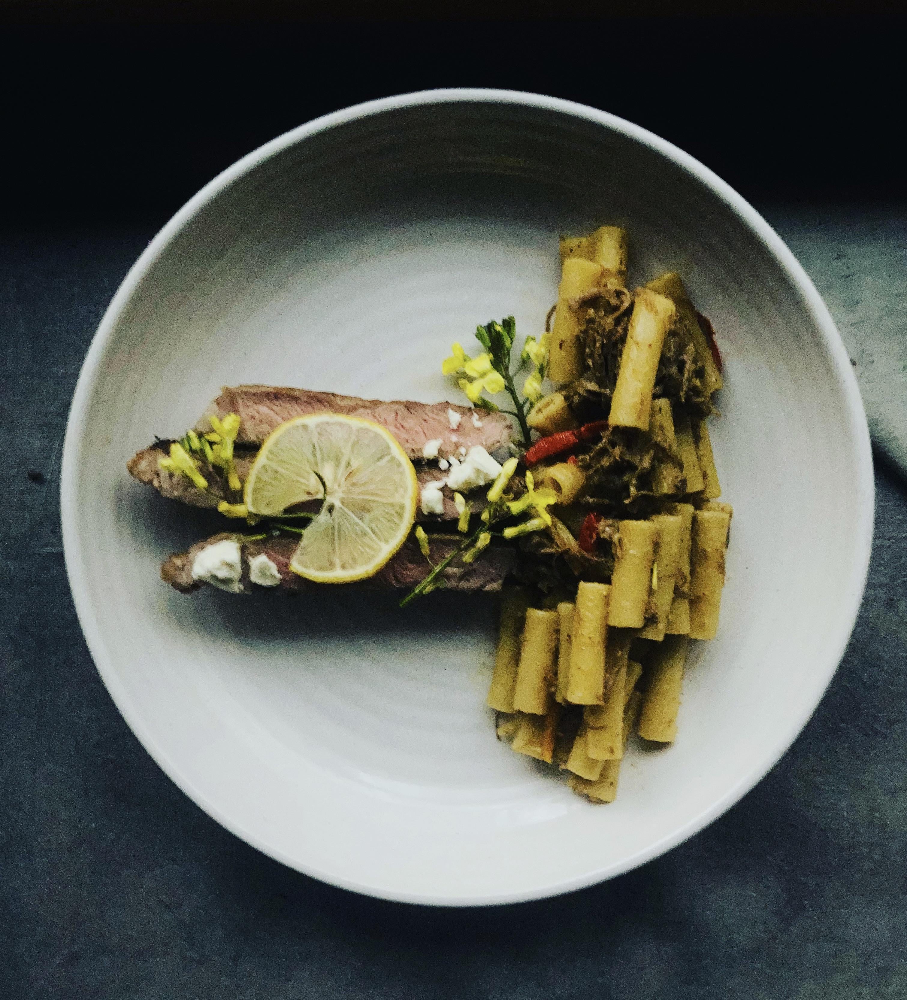 Slow roasted lamb pasta w lamb fat burr blanc paired w seared strip loin