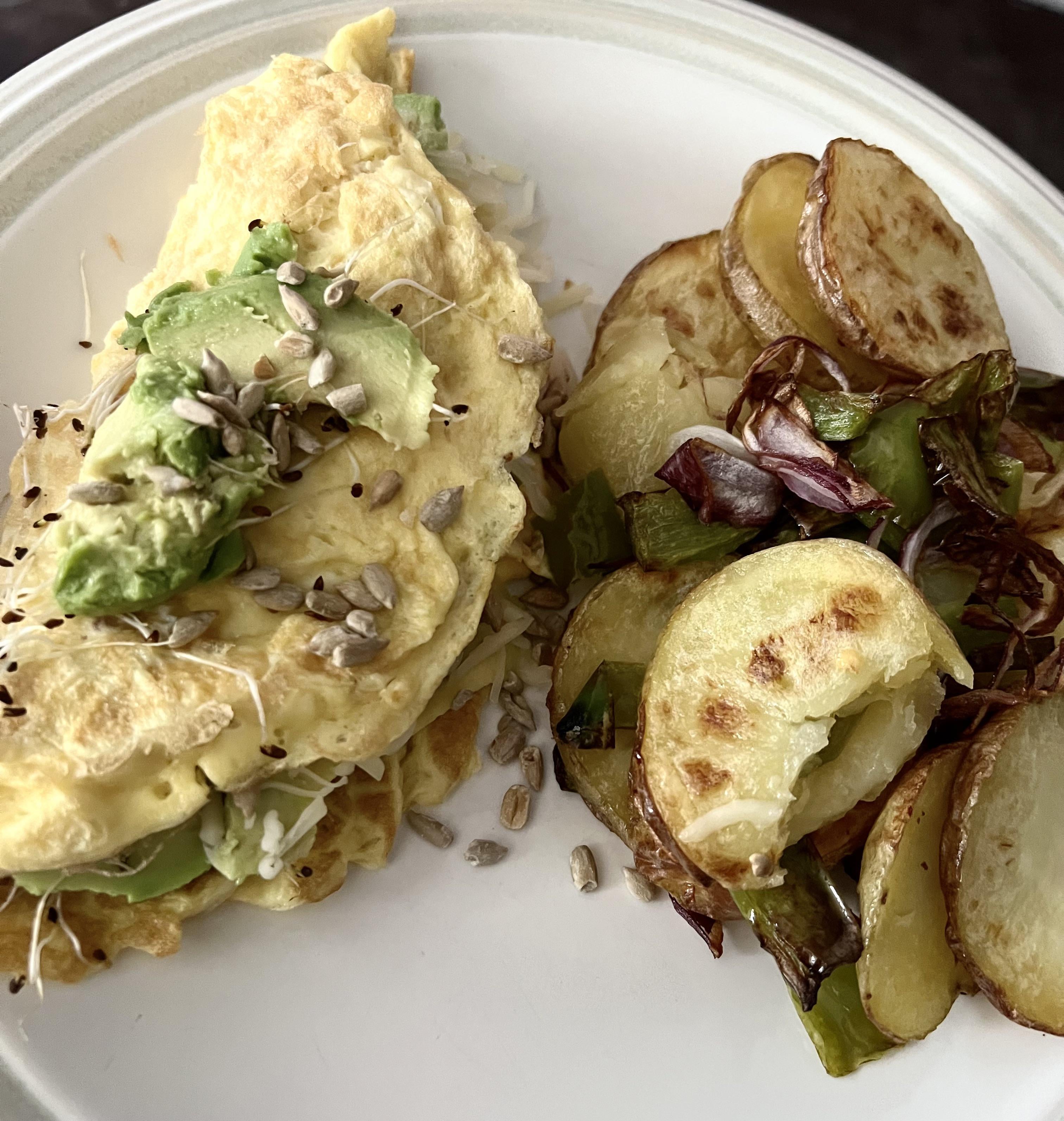 First had this in Bellflower, California in the 80s. By rights it should be egg whites, but didn’t have and was hungry. Egg whites, sprouts (used broccoli this time), avocado, Monterey Jack cheese, salted sunflower seeds. by Curious_Injury_333 Food Porn