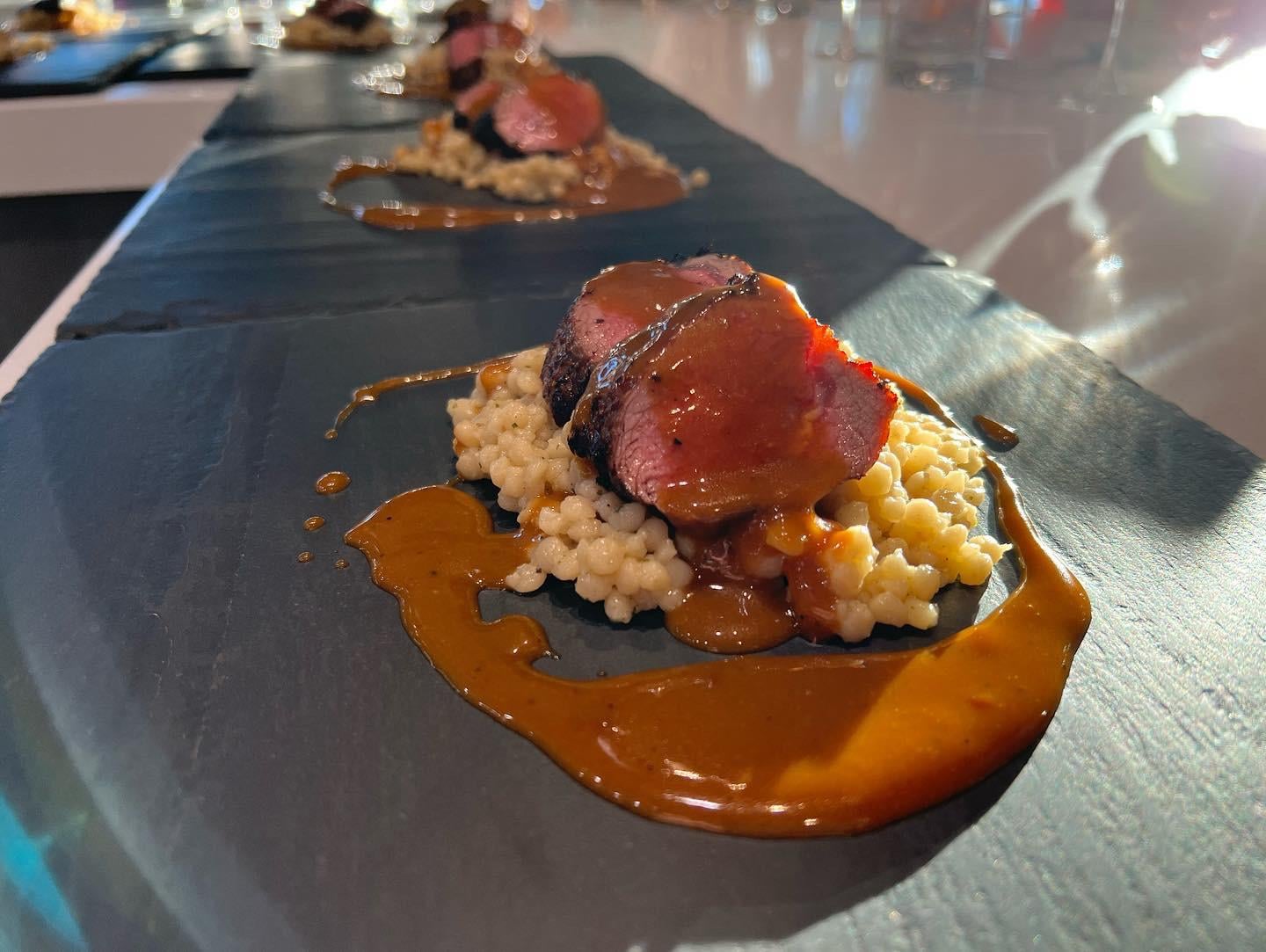Seared Lamb Loin, Parmesan Pearlized Cous Cous, Sauce Robert