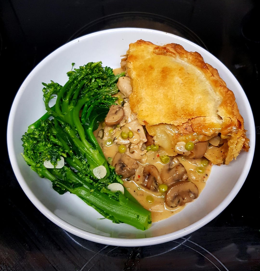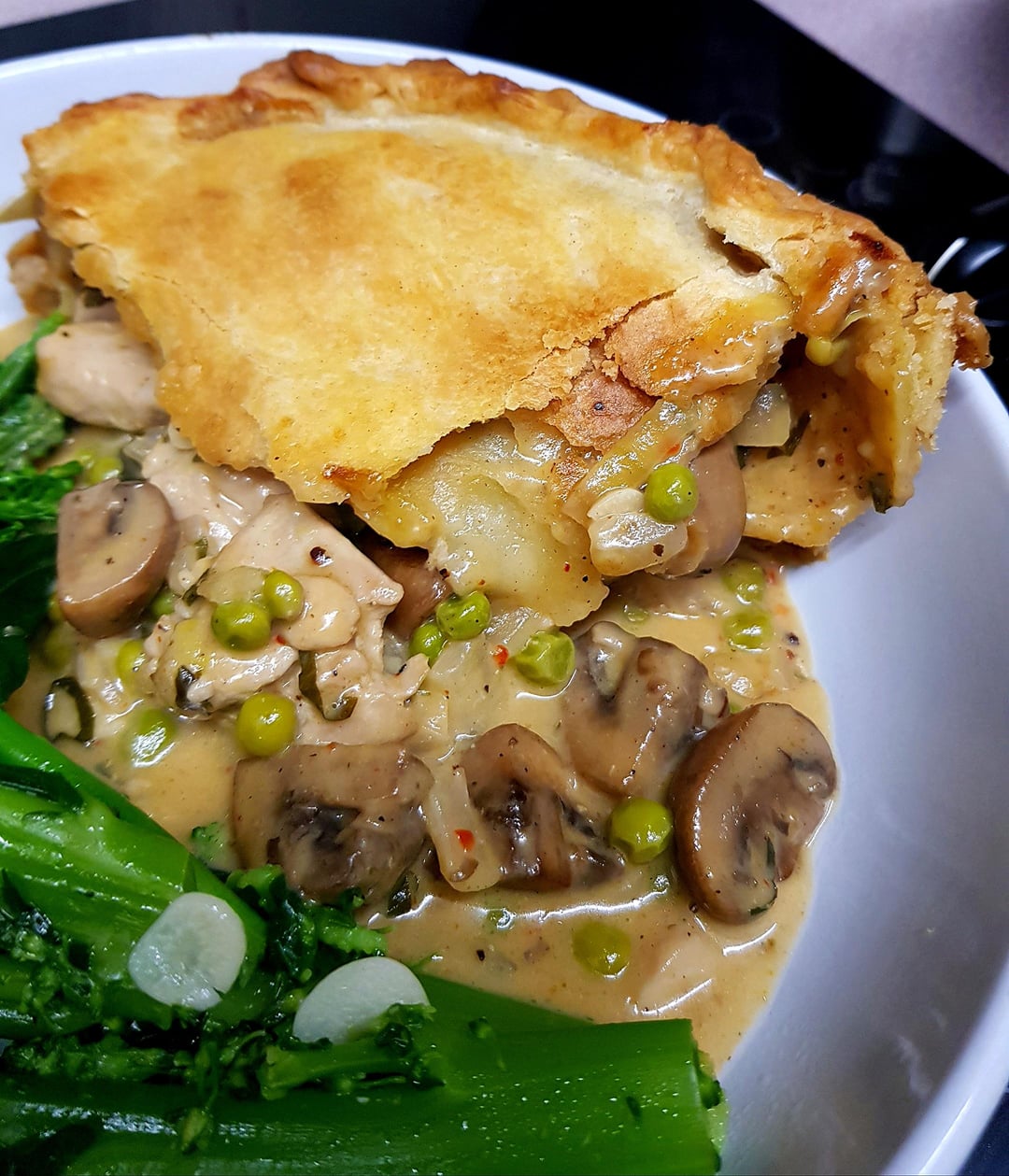 Chicken, Chestnut Mushroom and Pea Pie. Cheesy Cream Sauce and Suet Pastry Crust. Sauteéd Garlic Broccoli. by pink_flamingo2003 Dinner Tonight Tonight's Dinner