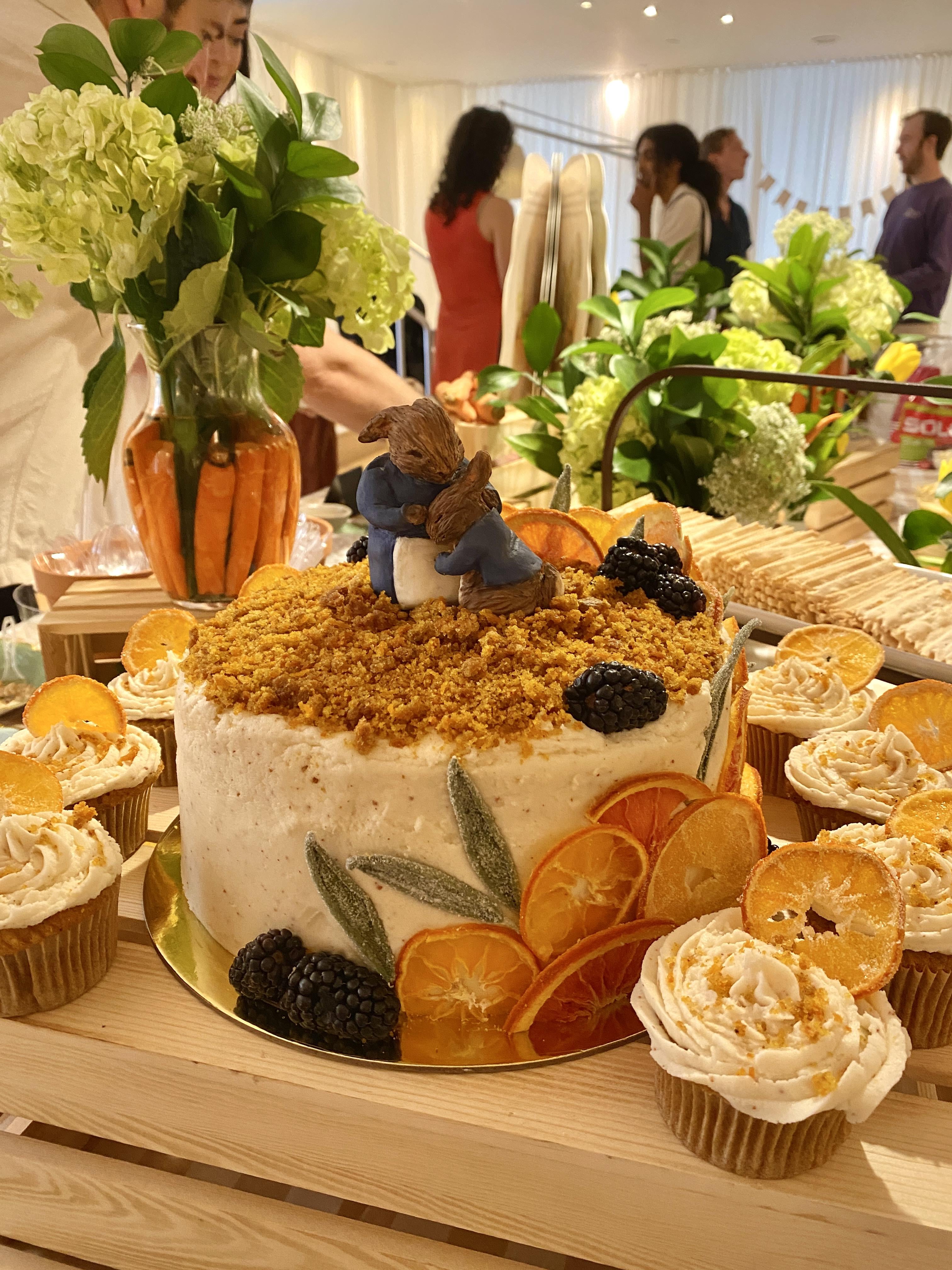 Carrot cake base with brown butter cream cheese icing. Decorated with candied orange and sage leaves, blackberries, toasted cake crumbs, and a handmade modeling chocolate figure.