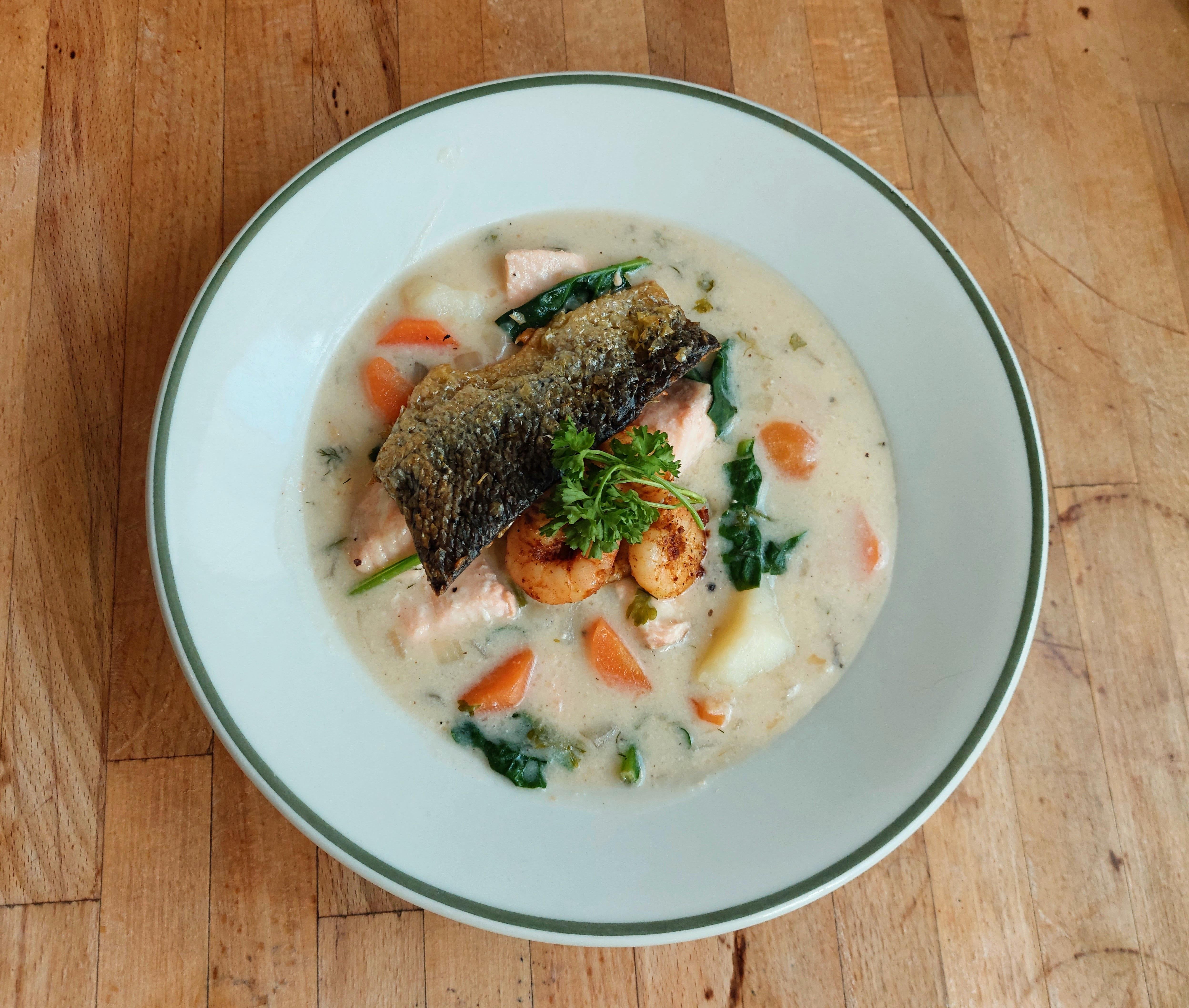 As part of my personal project to cook traditional dishes from around the world, I decided to make Bergen Fish Soup. When it comes to seafood, I’ve found that less is often more, and this dish really proved that. There seems to be a lot of flexibility with this dish, but I chose to make mine with salmon, shrimp, parsley, spinach, onion, garlic, carrot, sour cream, and fish stock.