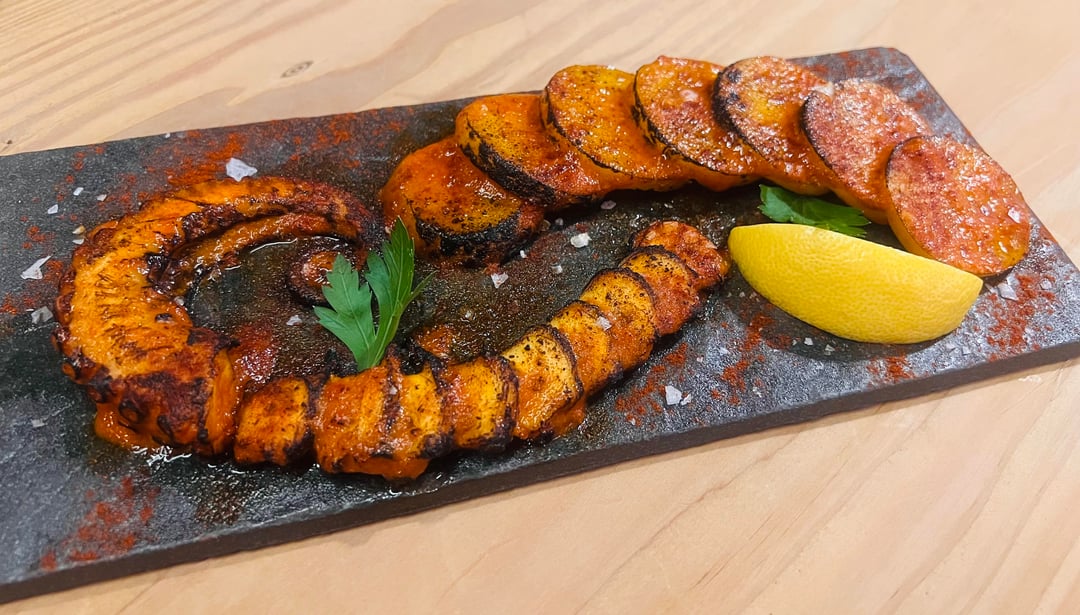 Charred octopus, served with baby potatoes. Rump steak, served with sweet steak sauce. Pork belly burnt ends 🤤🤤🤤 by Creative_Fox23 Food