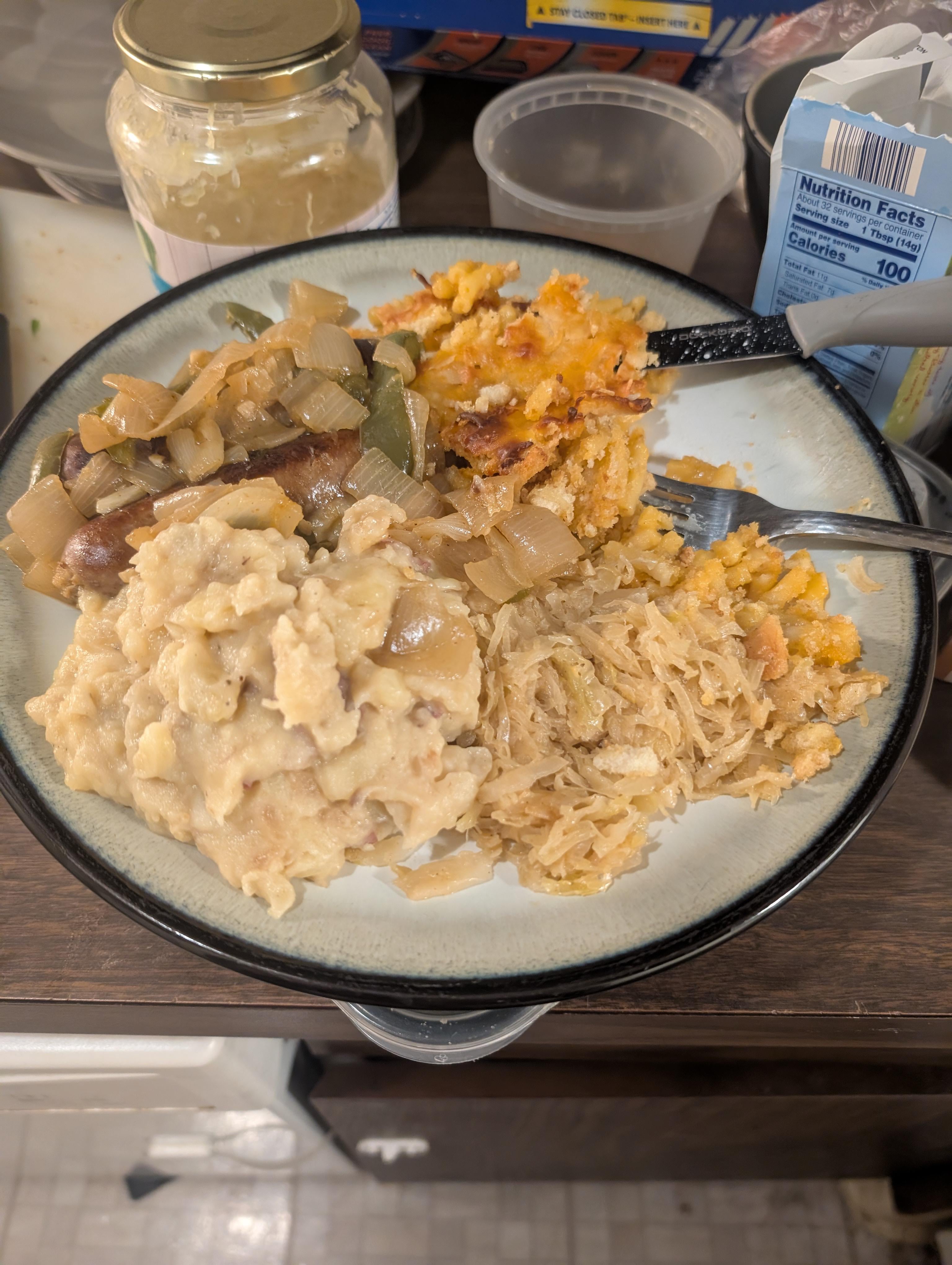 Very yellow/beige, but delicious. Beer brats and sauerkraut with baked mac n cheese and mashed potatoes. by cohonka Dinner Tonight Tonight's Dinner