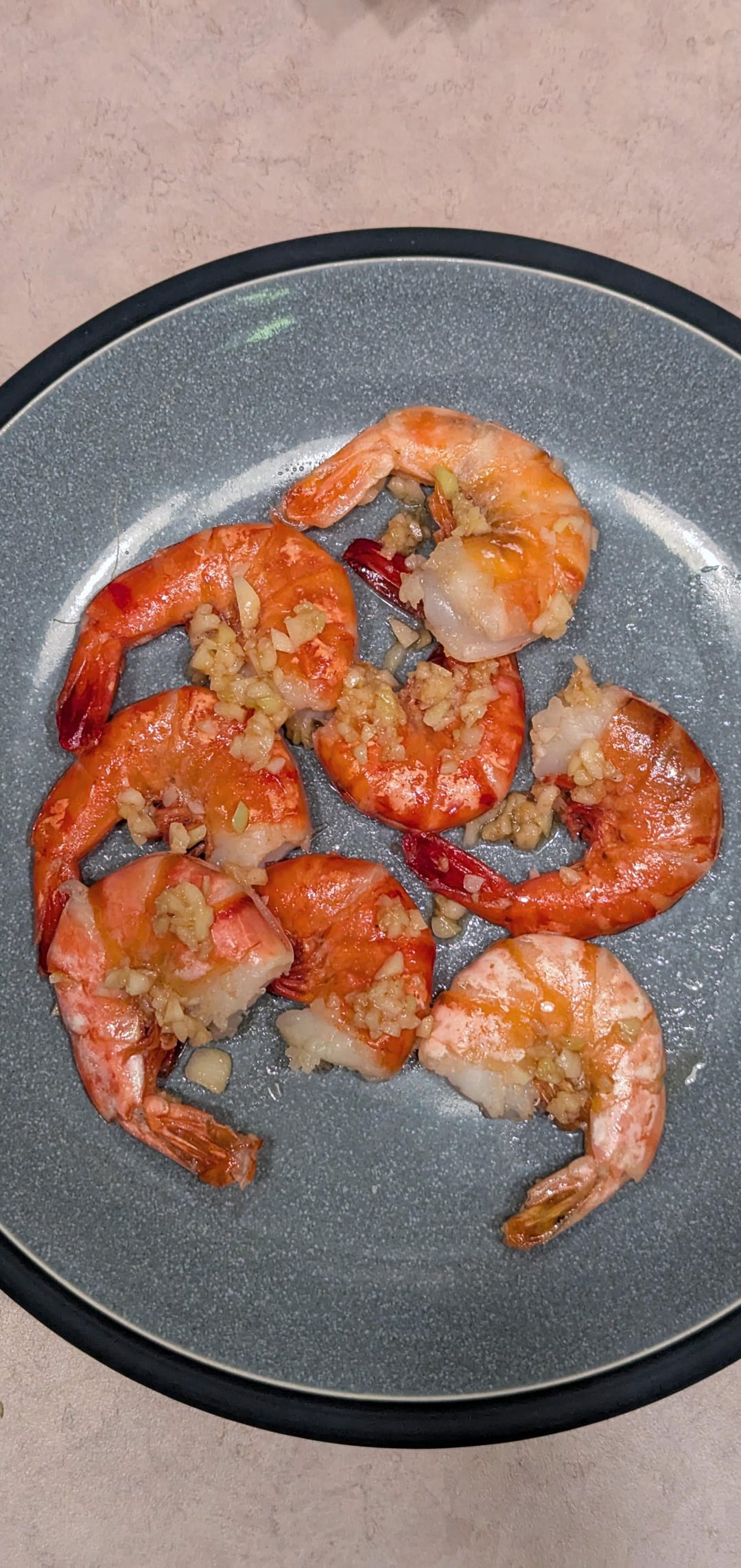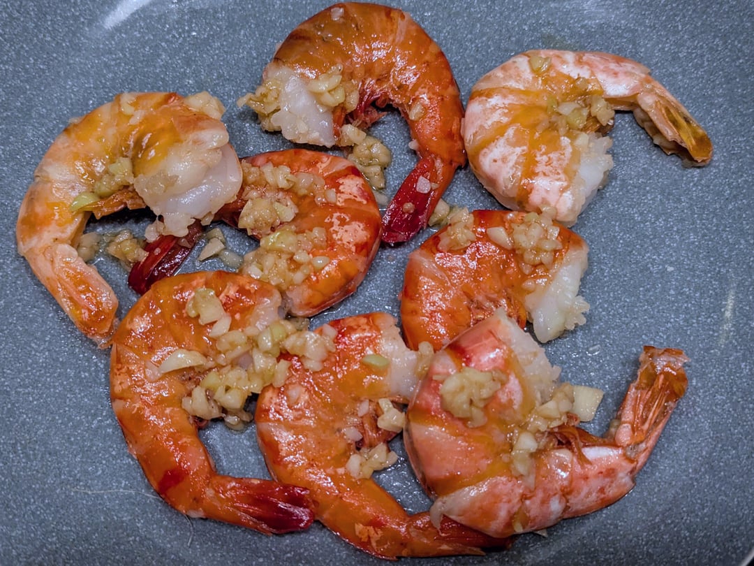 The shrimp were pan fried in the shell to keep them tender & juicy. I was finally able to get some large shrimp on sale, these are 16-20 per pound. Simple & tasty stuff. Made with fresh minced garlic, butter & sea salt.