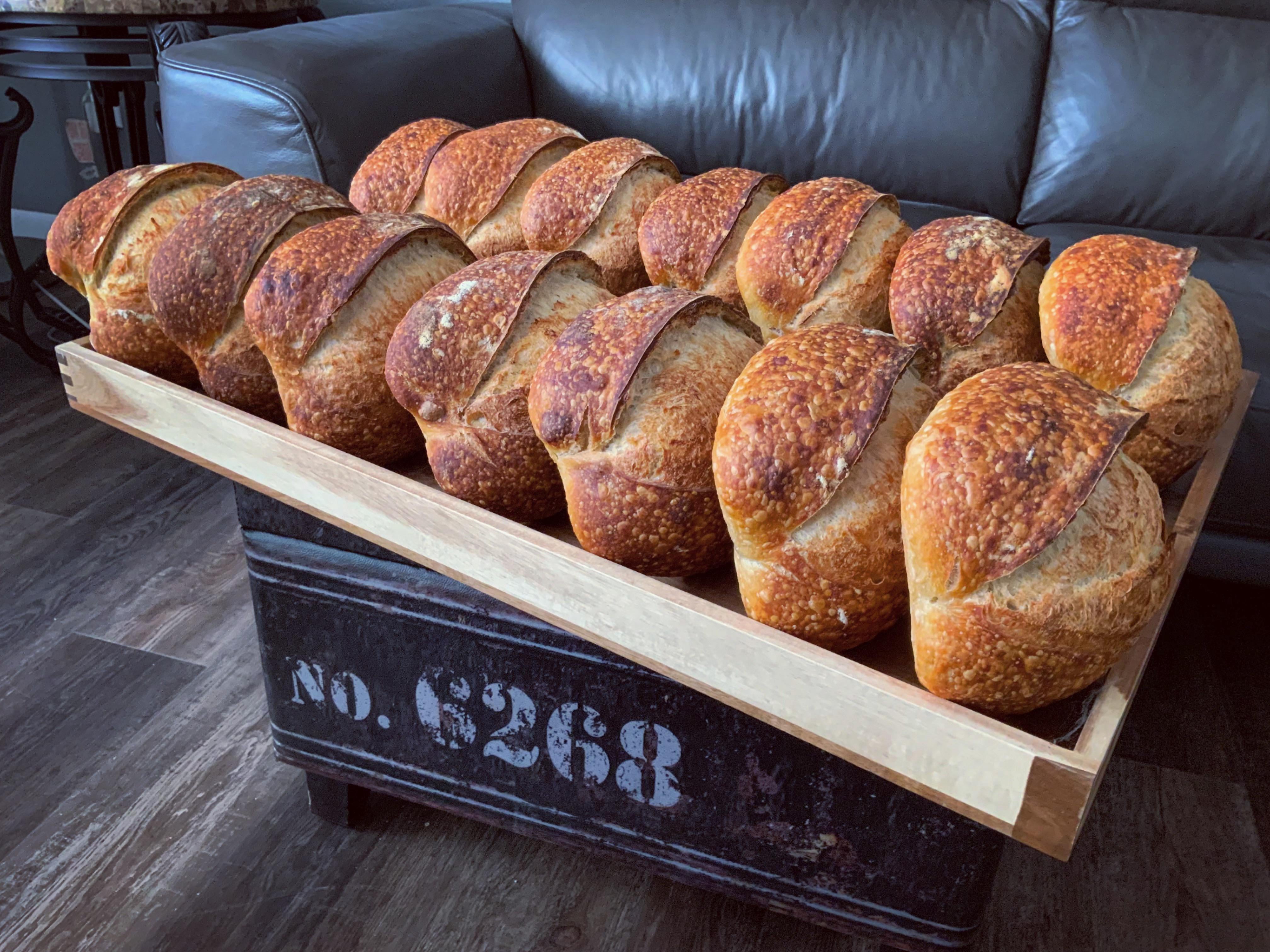 I bake for my friends, neighbors, and family. I also team up with a friend where we sell 16 loaves, each loaf is paired with a lb of his hummus, and sold, the proceeds from these monthly bakes go to help pay off the school districts lunch deficit. Not all made it in the photo, only so big of a wooden tray.