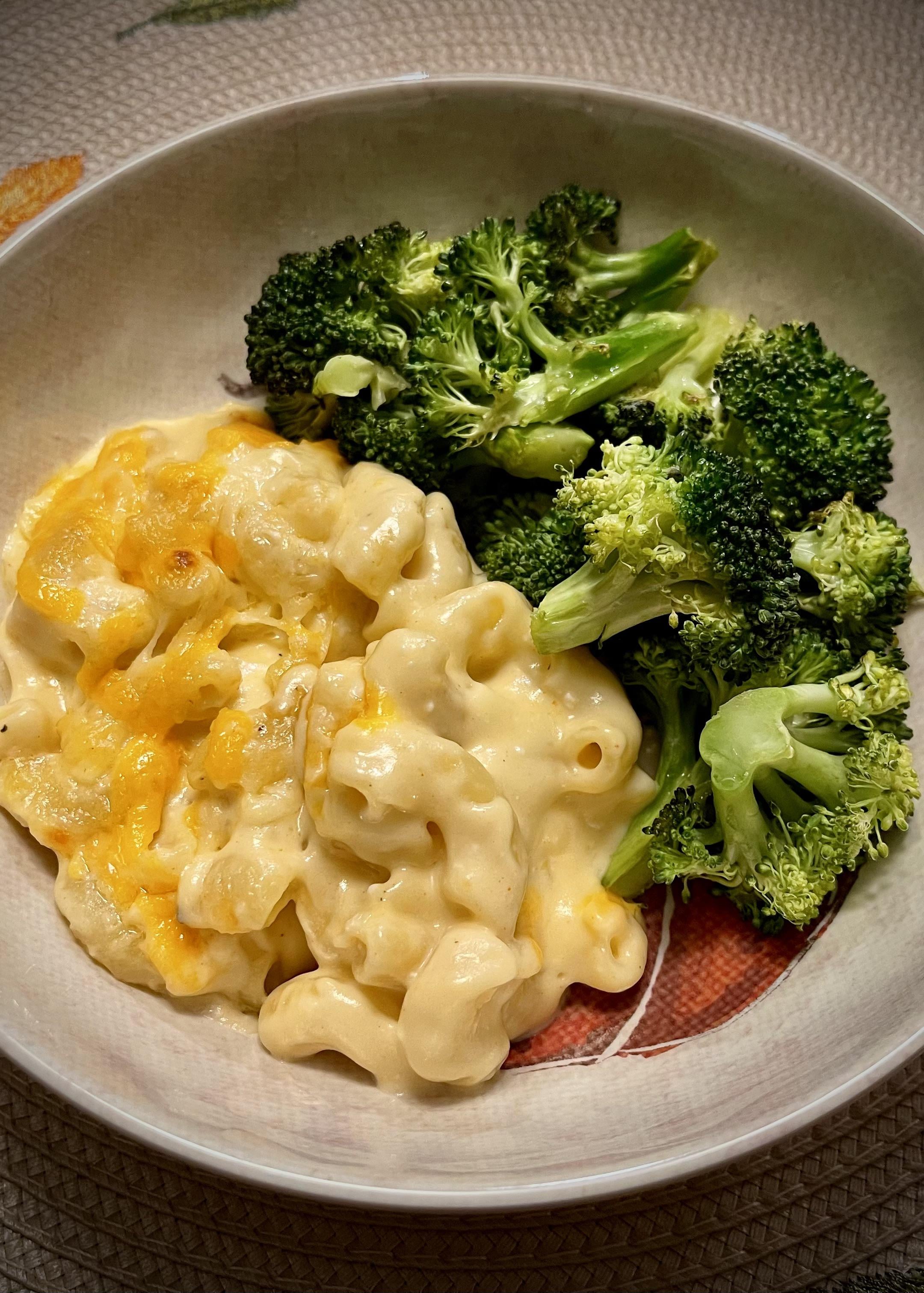 Ooey gooey mac and cheese with some crispy broccoli