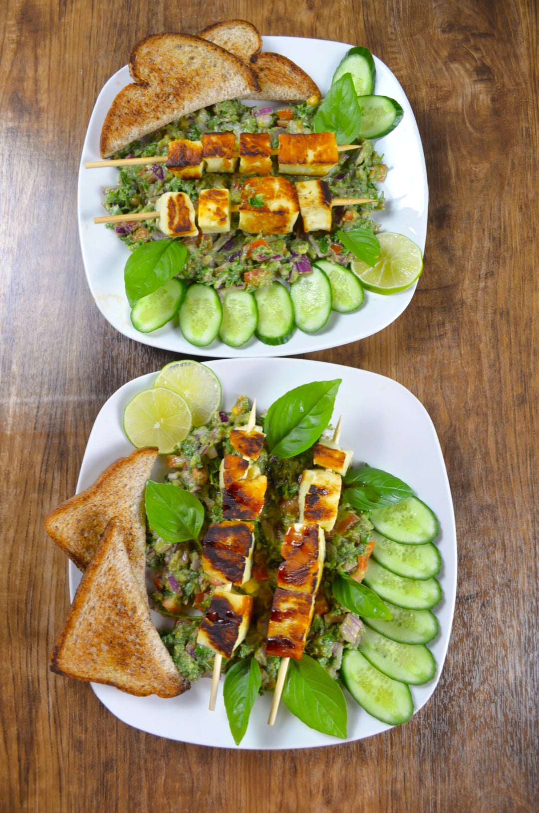 - Grill the halloum skewers until golden on each side.