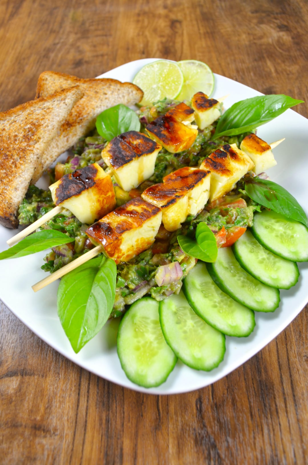 - Serve the grilled halloum with the avocado salsa and grilled bread.