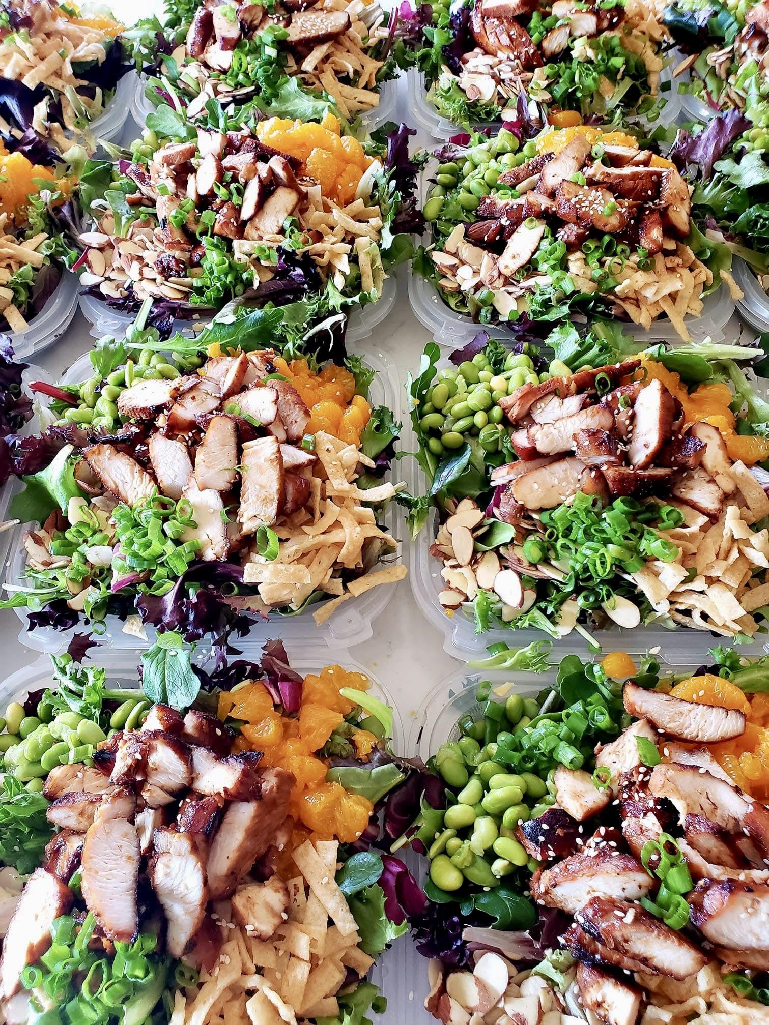 [Homemade] Asian chicken salad. I love salads and I used to sell them in my neighborhood. This was a fan favorite with teriyaki grilled chicken, mixed greens, almonds, mandarins, edamame, wonton strips, green onion, and sesame seeds with a homemade pineapple Asian vinaigrette.