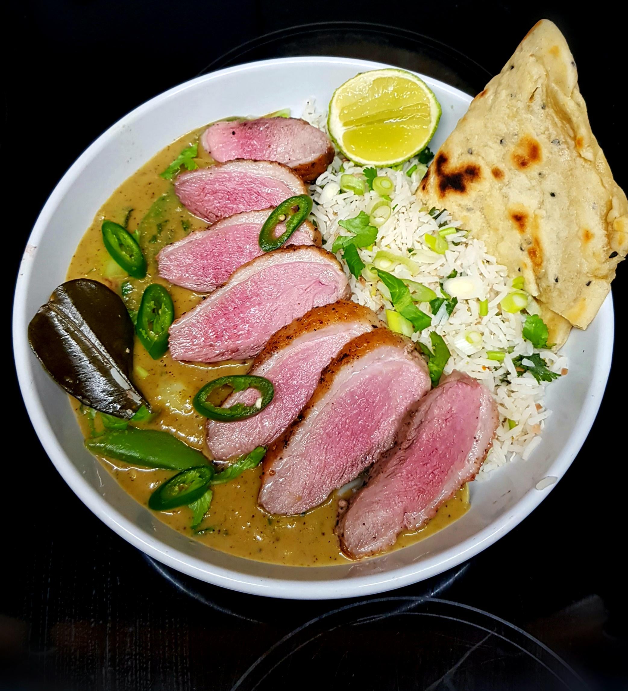 From Scratch – Duck Thai Green Curry with Snap Peas and Pak Choi, Coconut and Coriander Lime Rice and Soft Bread for Dipping. by pink_flamingo2003 Dinner Tonight Tonight's Dinner