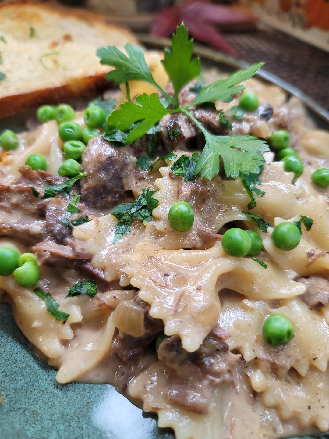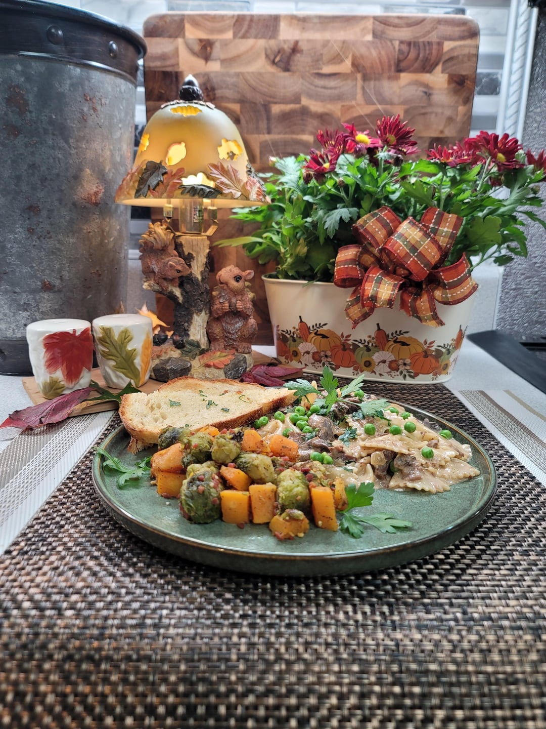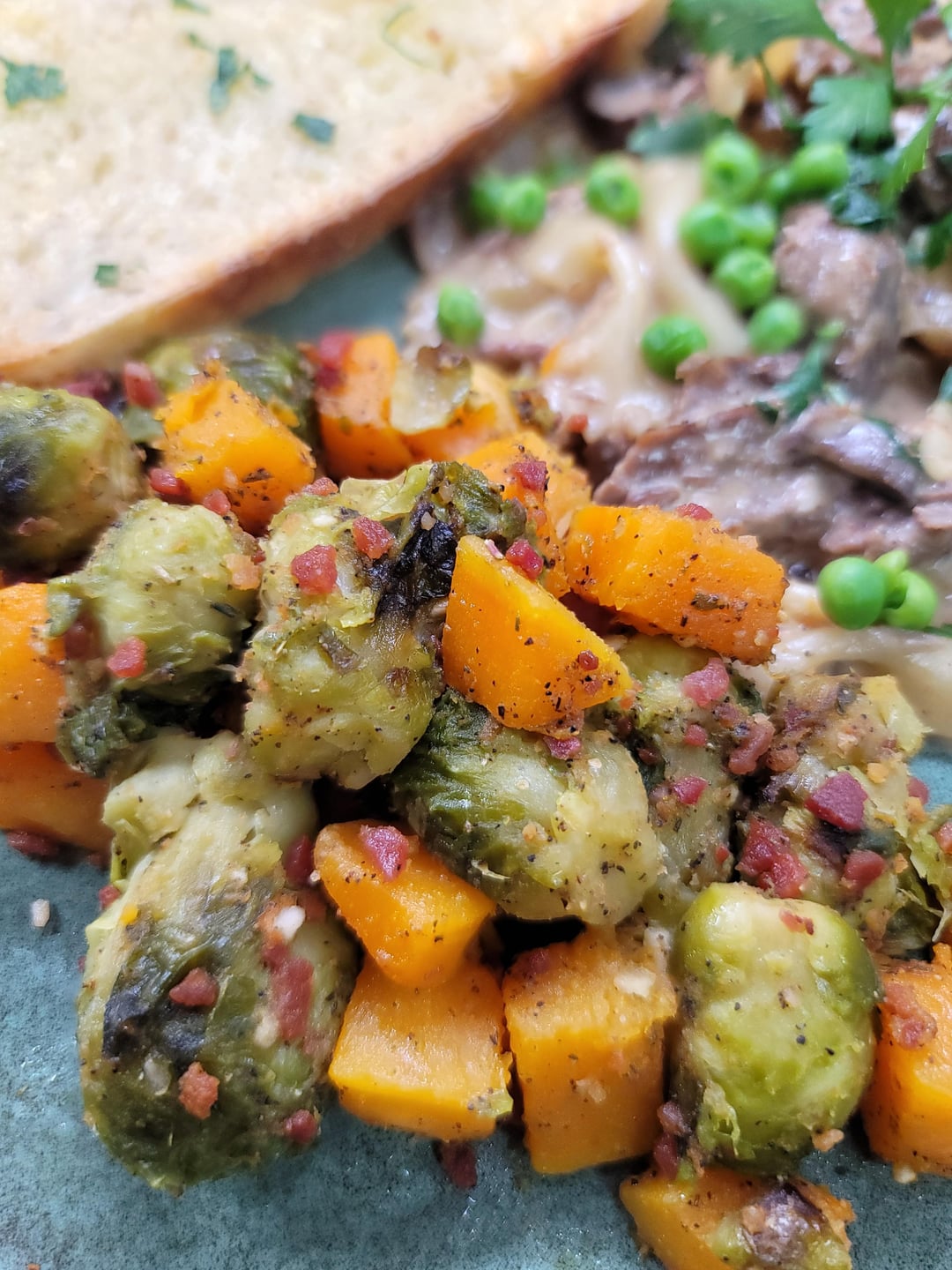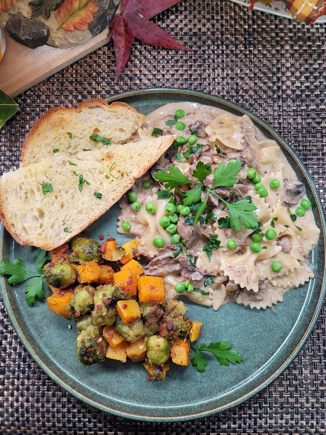[Homemade]Stroganoff! Shredded Venison, Creamy Mushroom/Onion Sauce over Bowtie Pasta. Roasted Brussels Sprouts and Butternut Squash tossed in Seasoned Bacon Bits. by Inner-Sir-1214 Dinner Tonight Tonight's Dinner