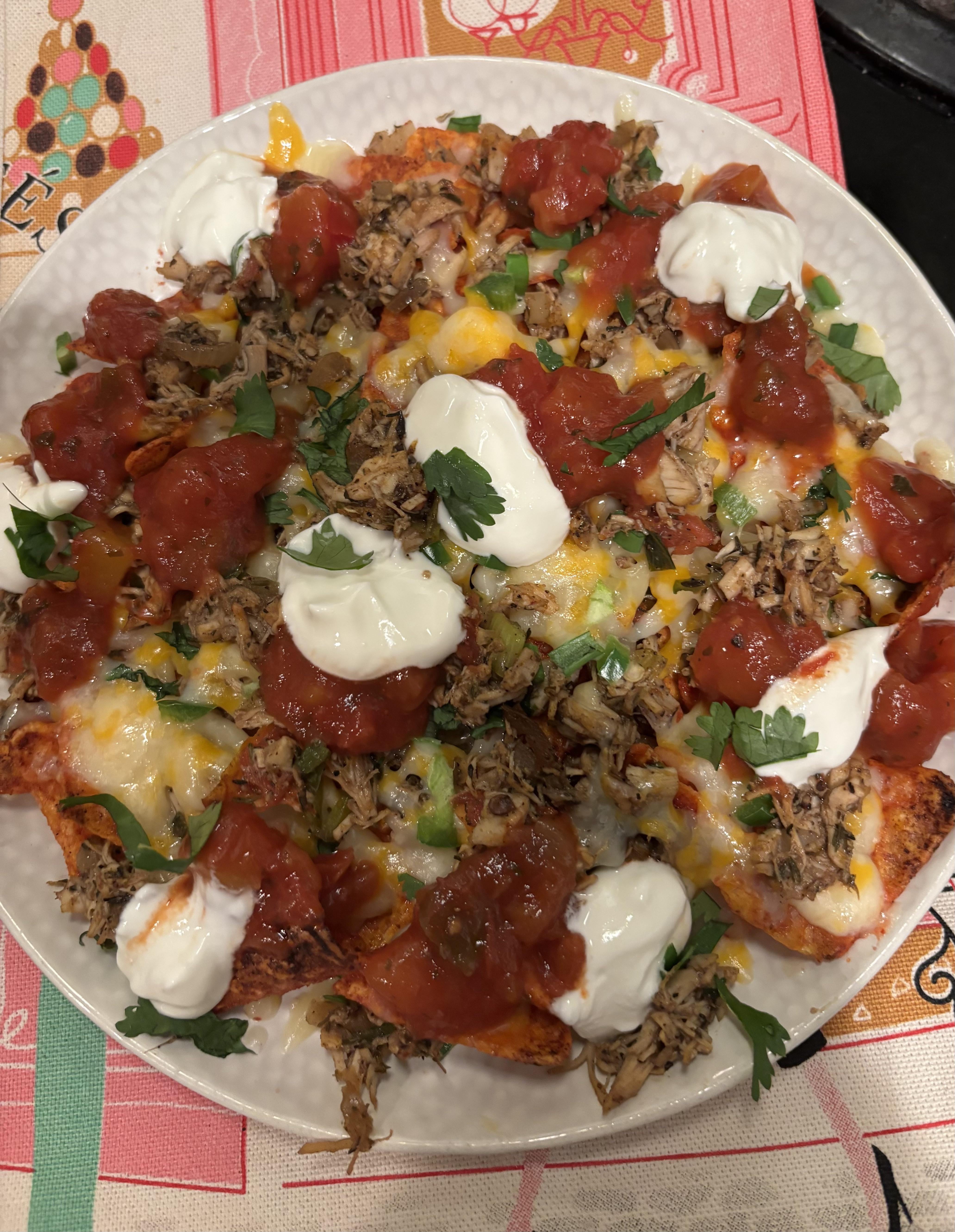 Jerk Chicken Nachos- Bold BBQ Doritos, shredded jerk chicken, mozzarella cheese, cheddar cheese, jalapeño, mango salsa, sour cream, green onion & cilantro by Capital-Eggplant-177 Food Porn