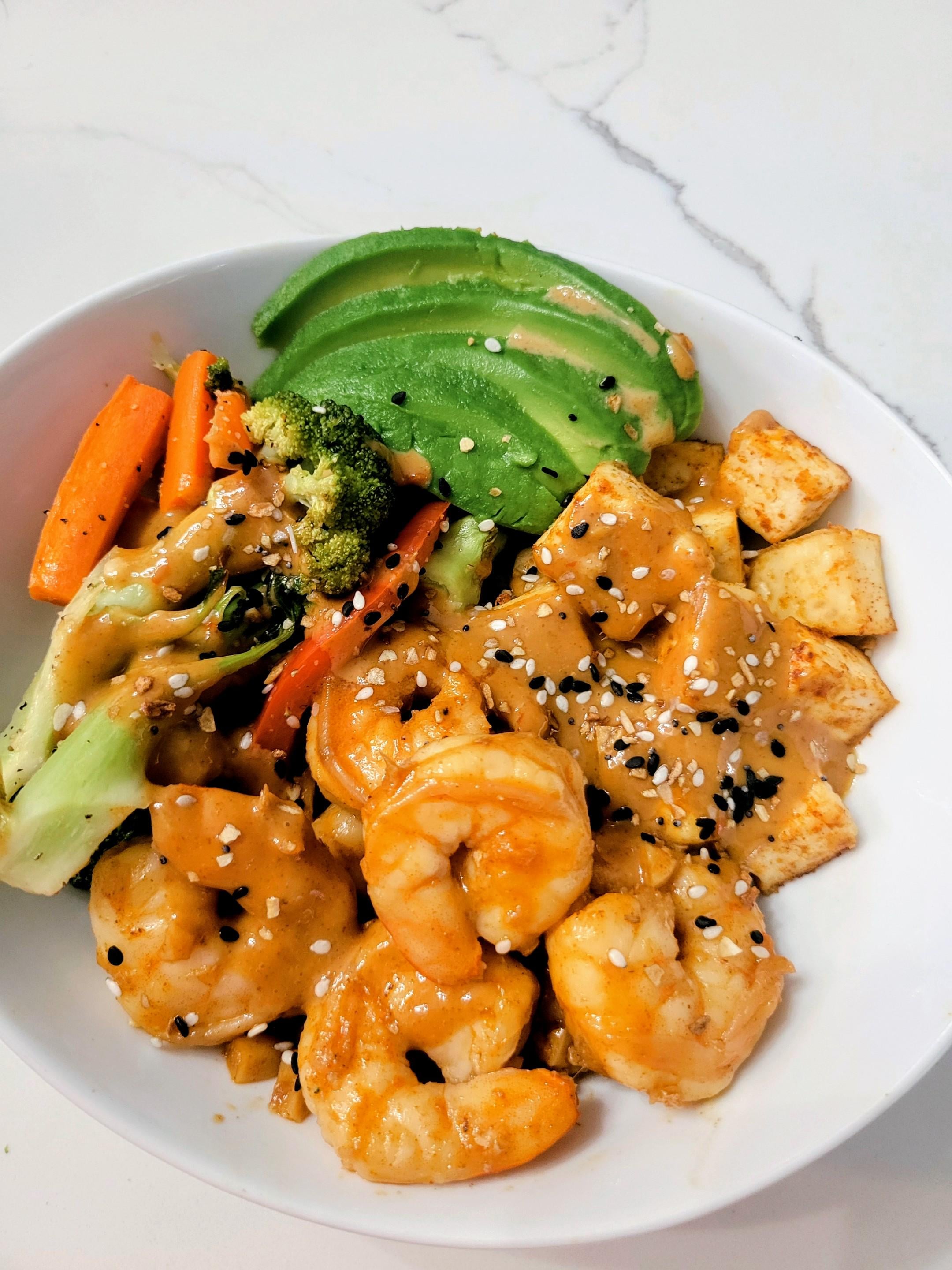 Spicy peanut sauce over oven roasted Tofu and veggies with pan seared shrimp.