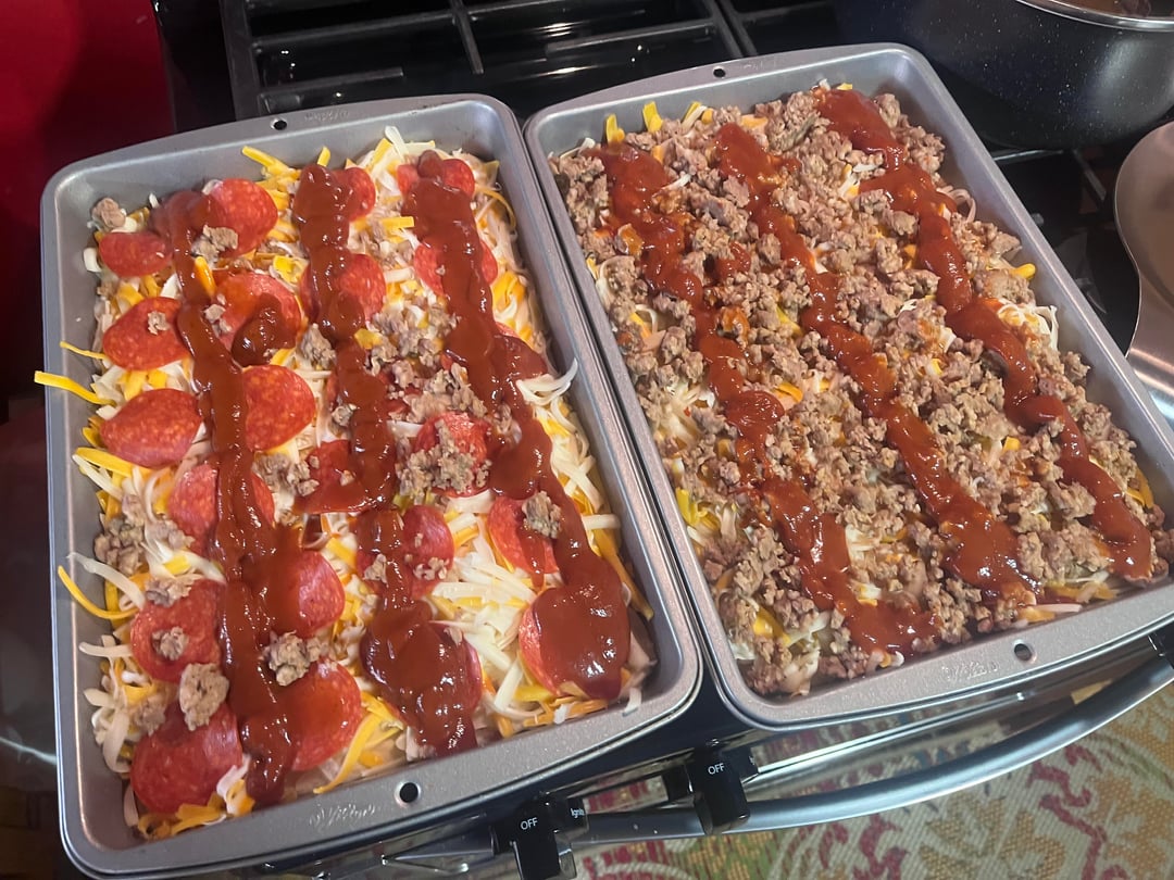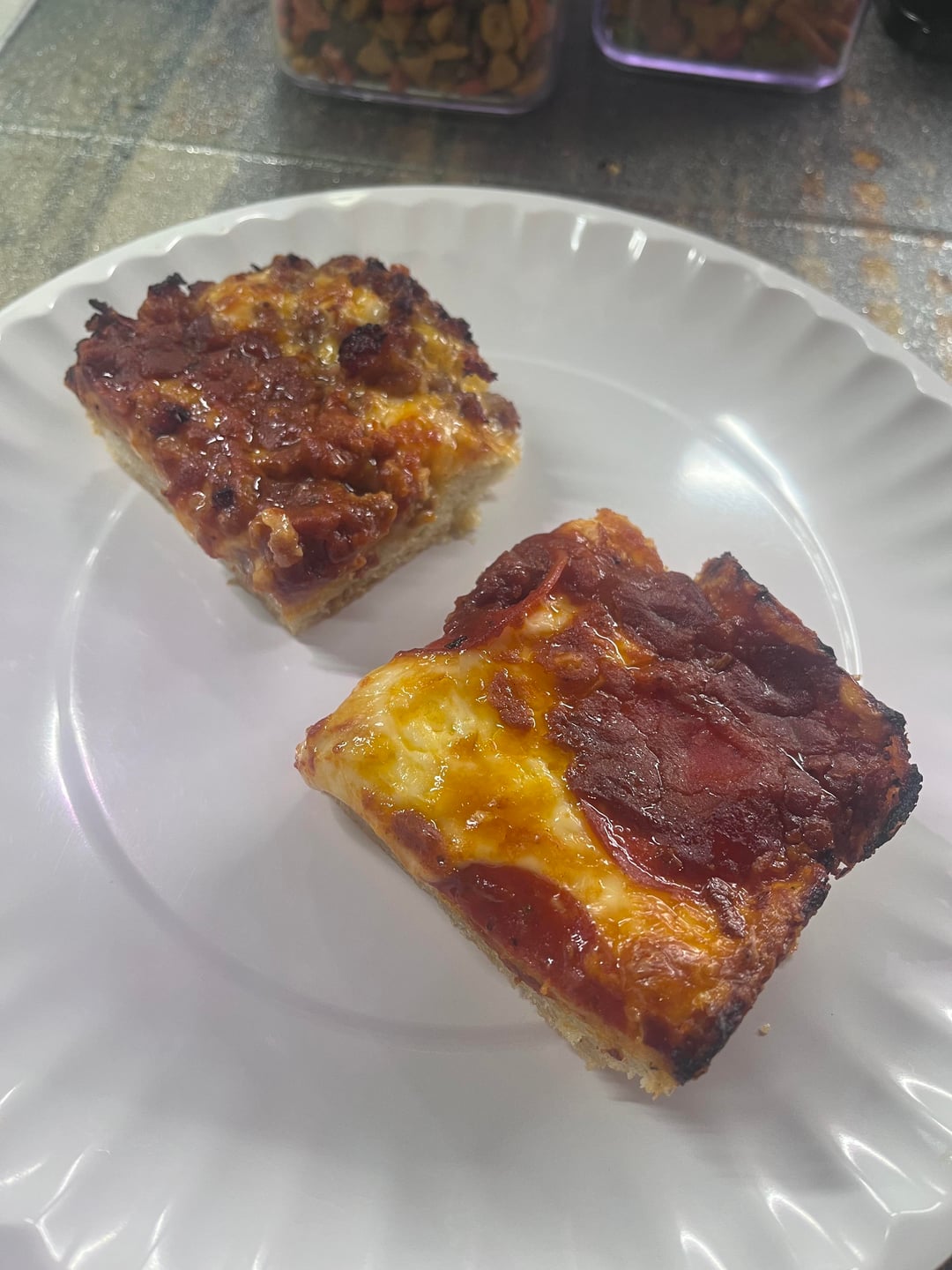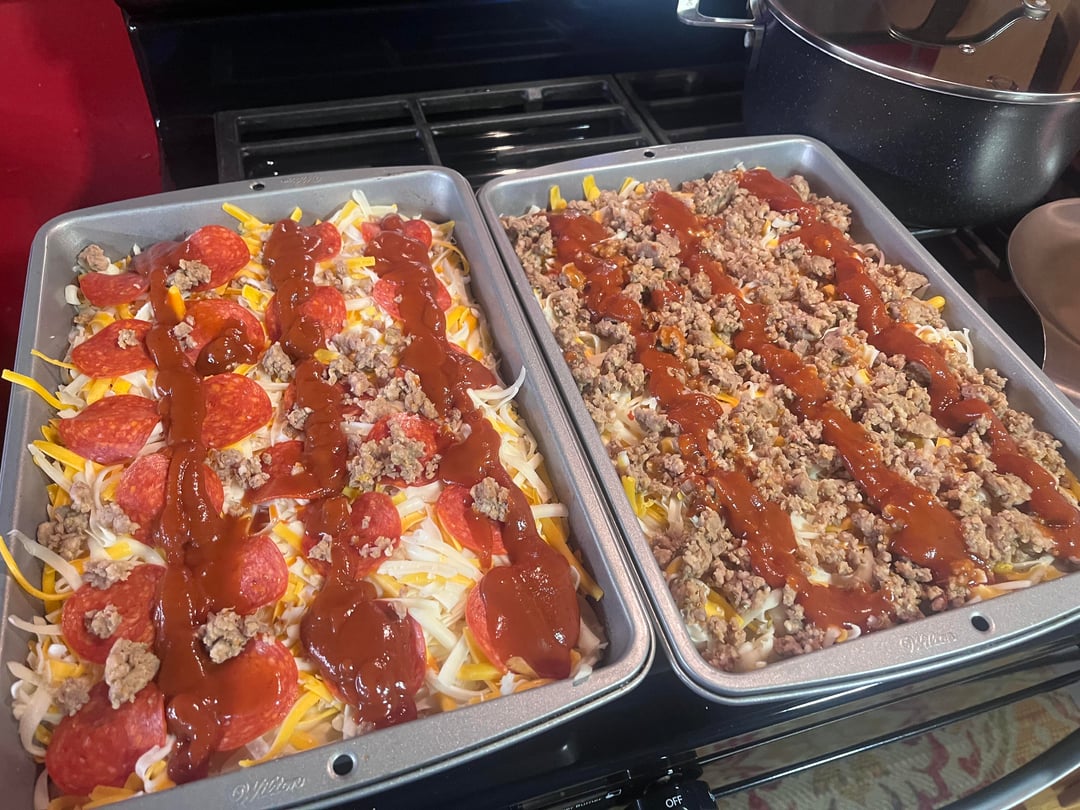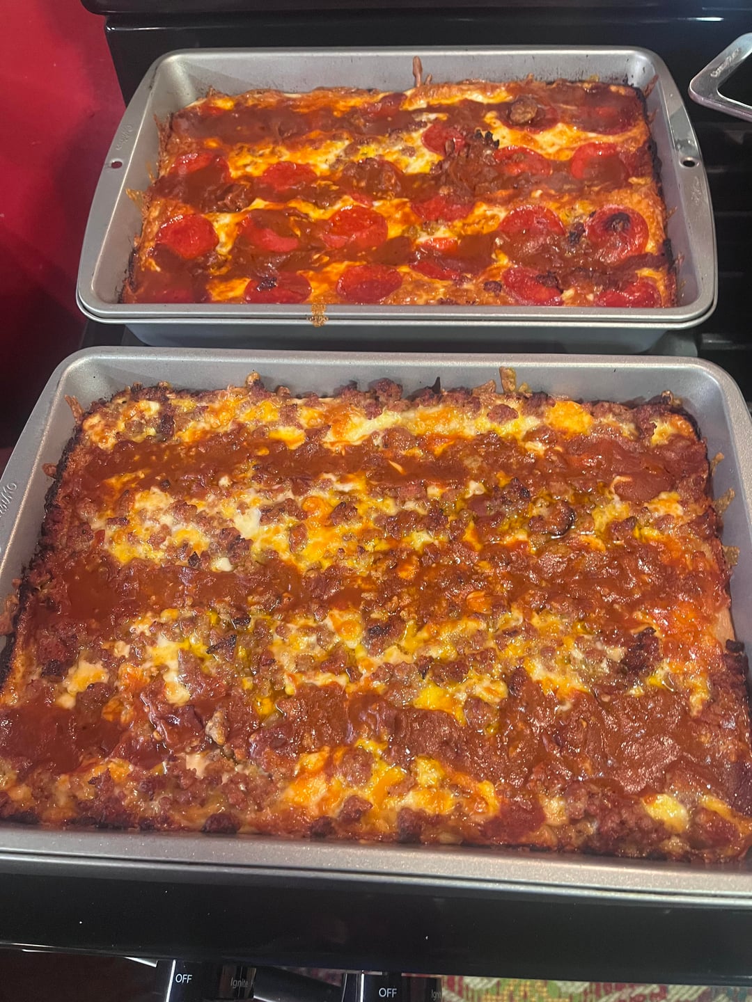 For supper, I made two homemade Detroit-style pizzas completely from scratch. Since none of the stores in my area carry Brick cheese, I used a blend of mozzarella and cheddar instead. For the toppings, I went with pepperoni and Italian sausage — my roommate and I both really enjoyed them.
