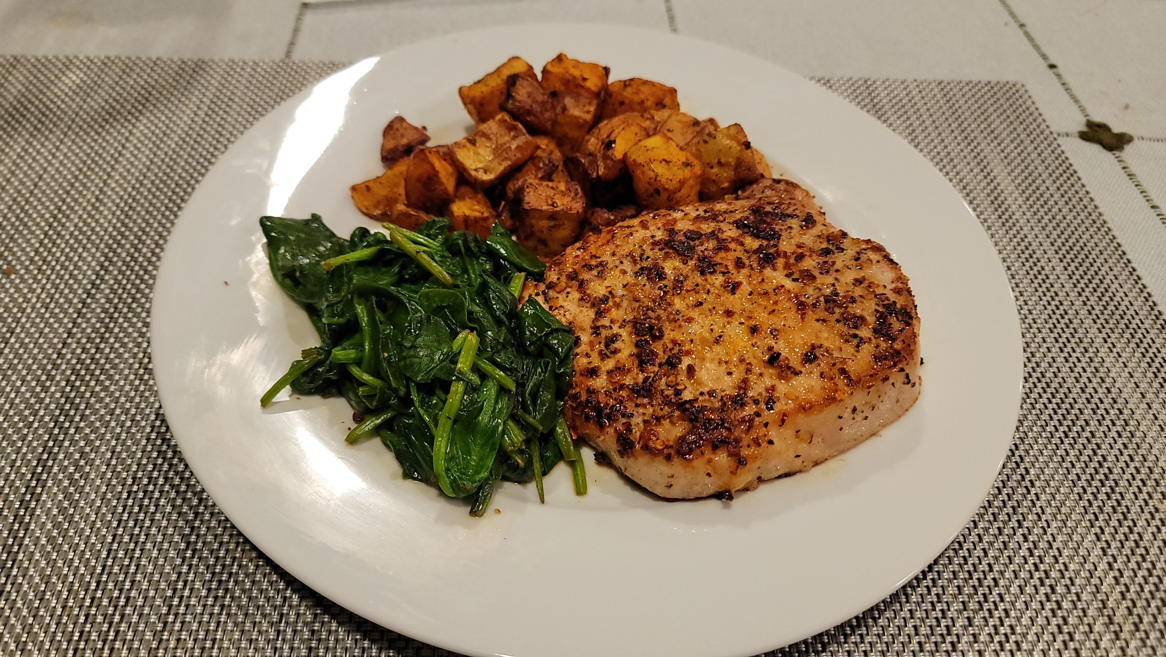 Pork chop, potatoes, and spinach.