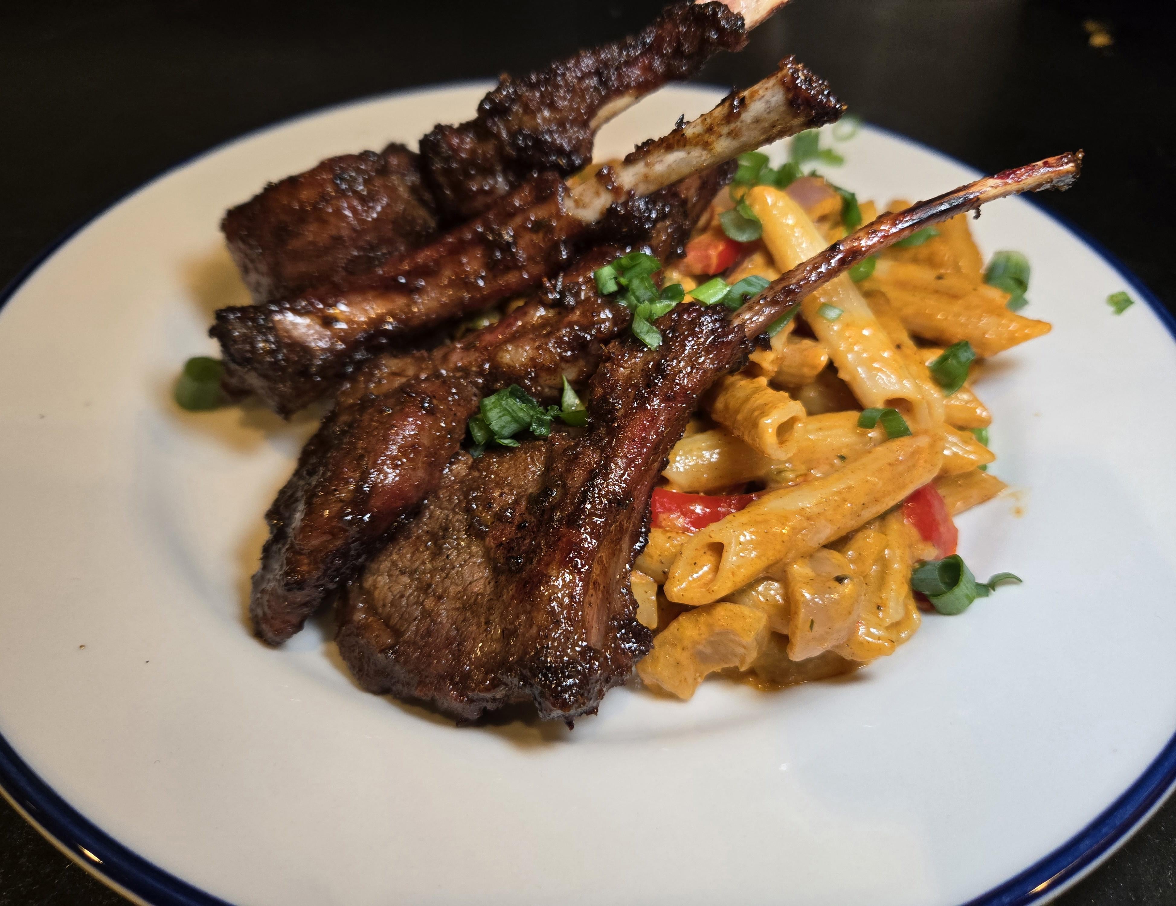 Wife is out of town visiting her boyfriends parents so i made Striploin steak, Alfredo pasta and Cajun shrimp.
