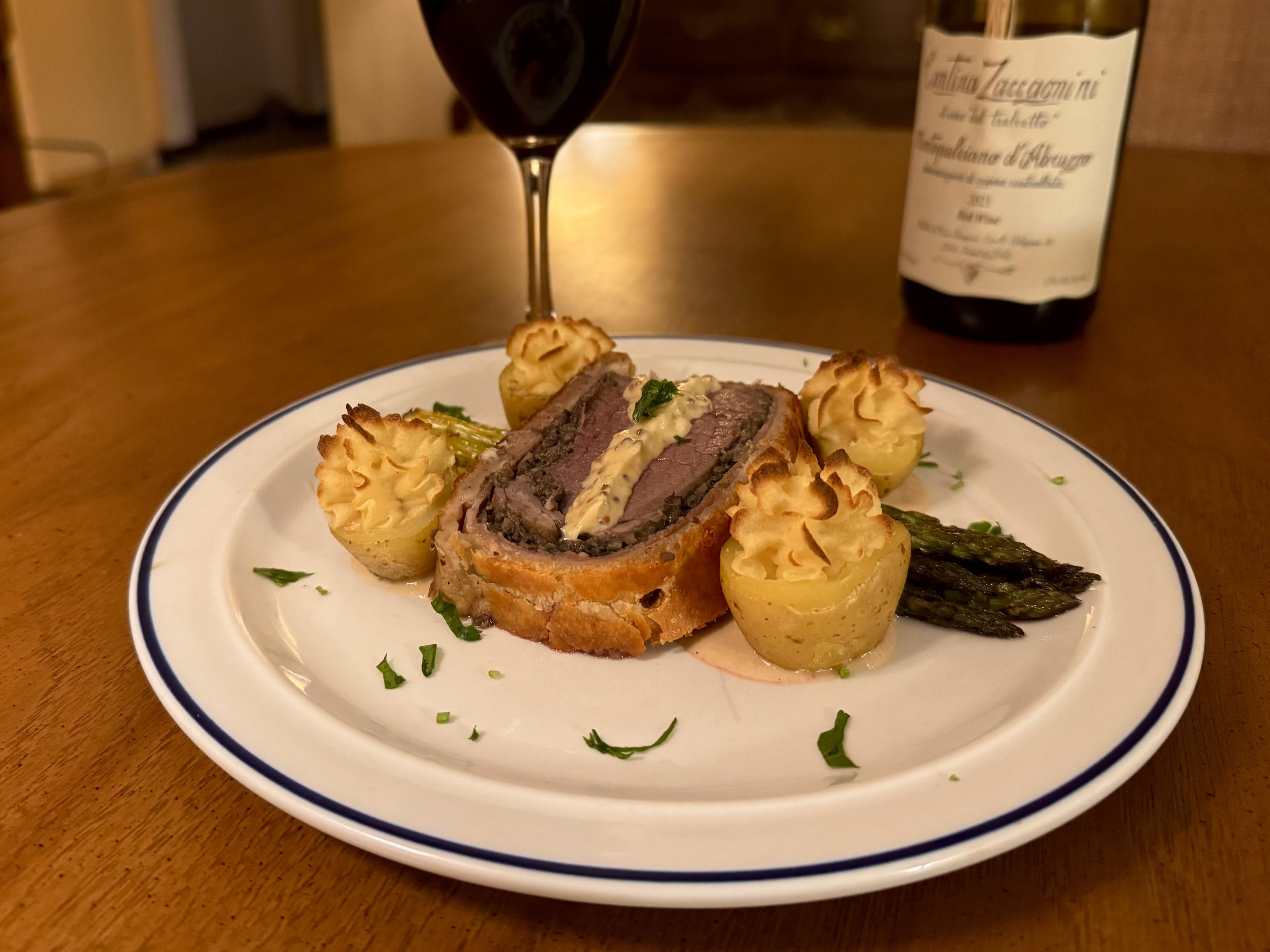 I made Venison Wellington, Duchess Potatoes with Smoked Onion Soubise, Sautéed Lemon Asparagus, and Mustard Cream Sauce. by AdmiralMoonshine Food Porn