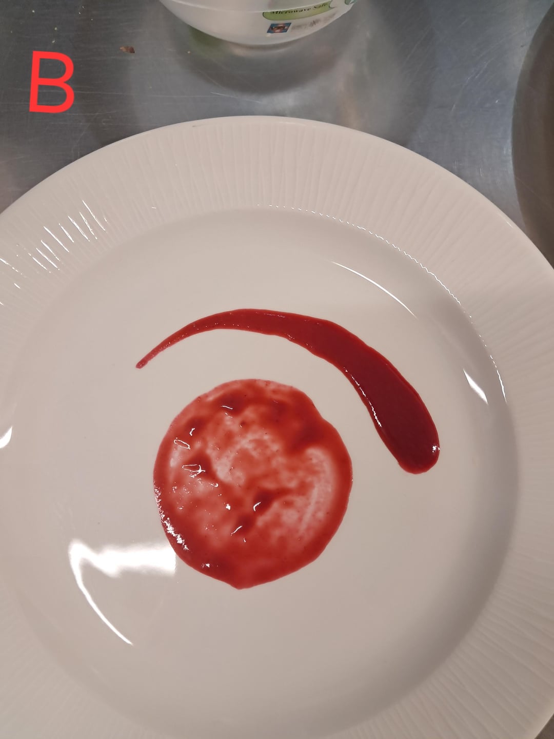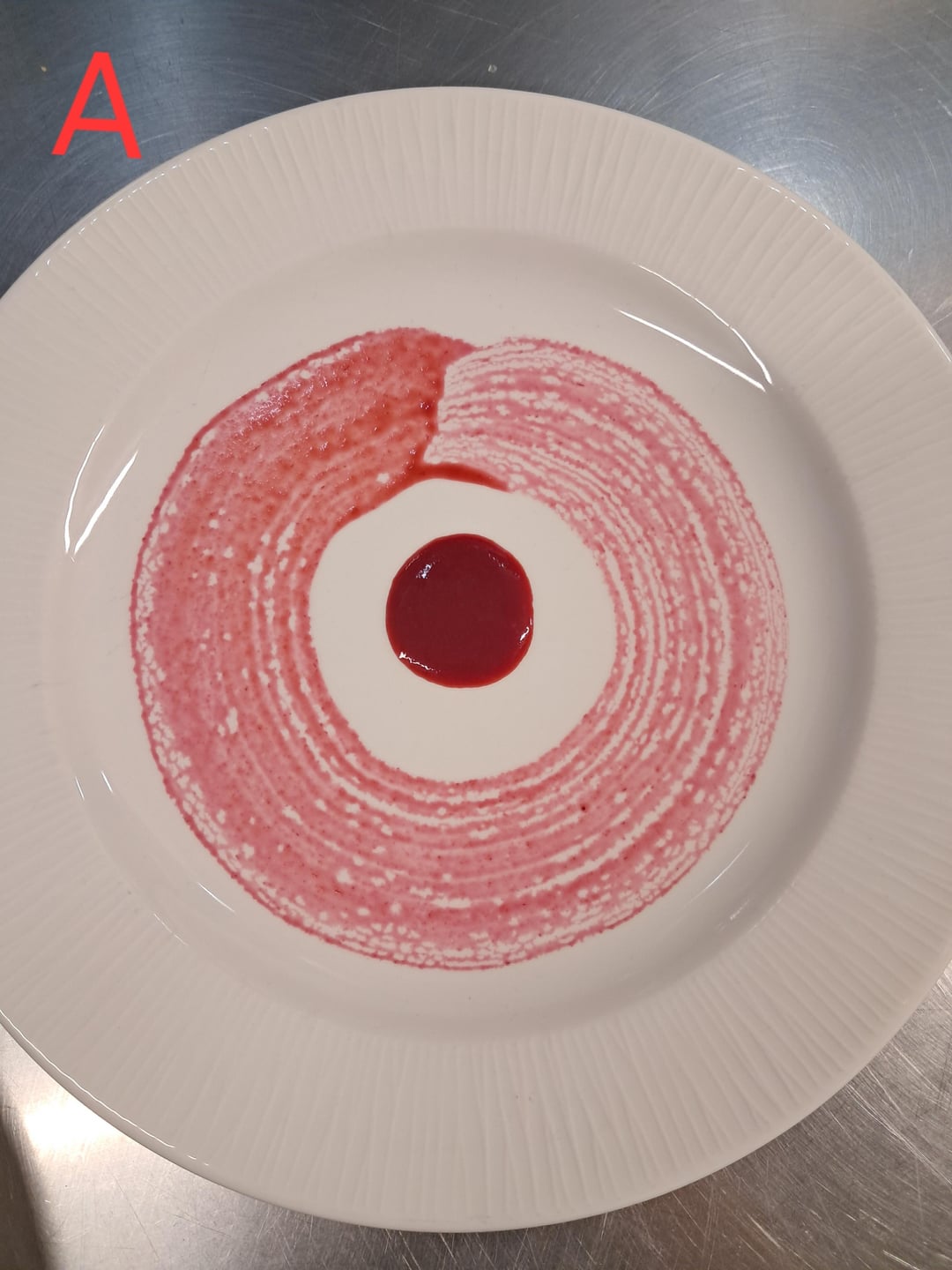I think A looks better, but I would prefer to eat B. I don’t hate the smear like many here, but I’d be super irritated if I had a bunch of thinly spread sauce all over the plate that I couldn’t even get a bit of onto my dessert.