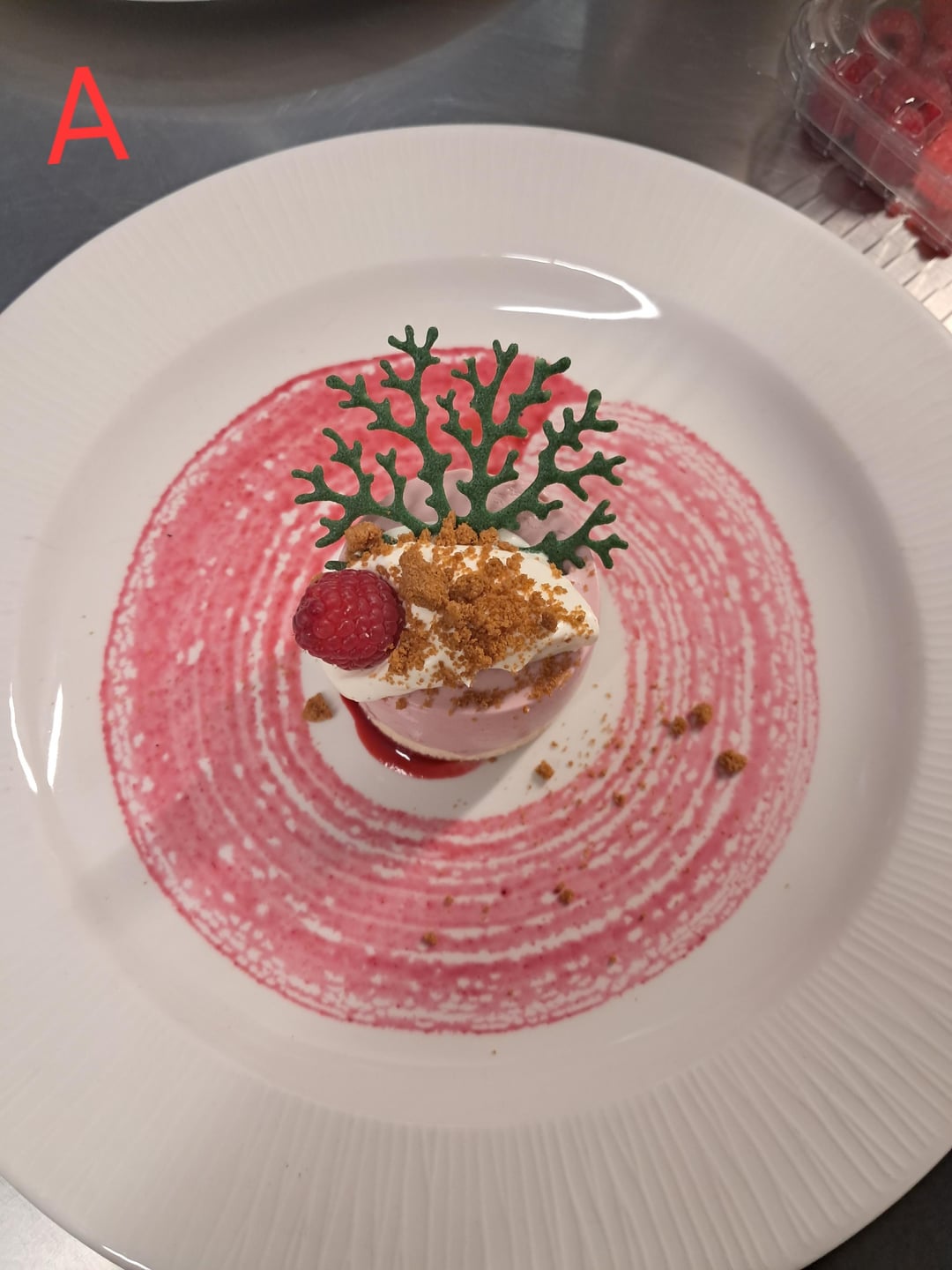 For thé plating leave the sauce. Use a mold for gelatine. To have something clean to put your dessert on.