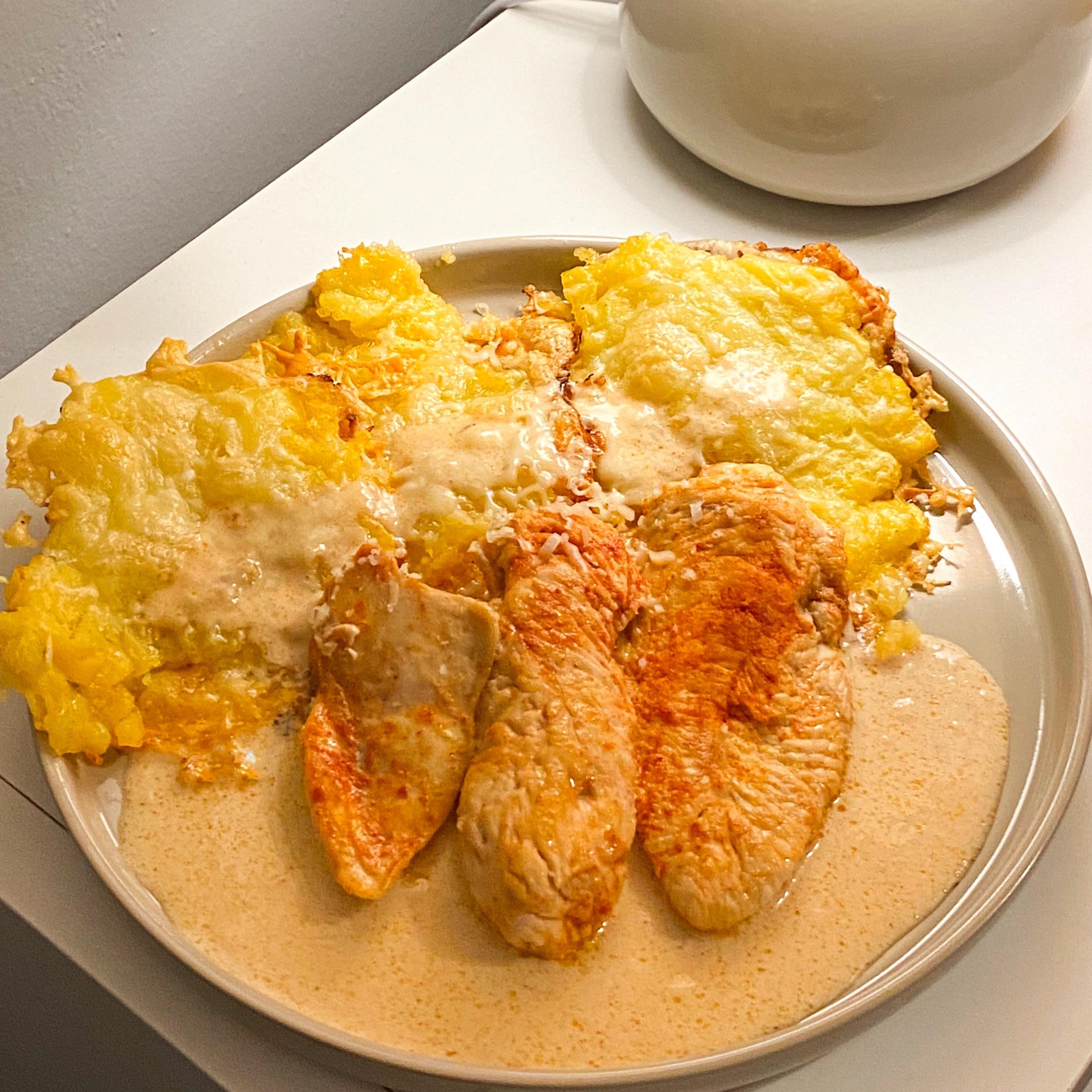 Chicken with creamy sauce, smashed baked potatoes and CHEESE by kristinahh3 Dinner Tonight Tonight's Dinner