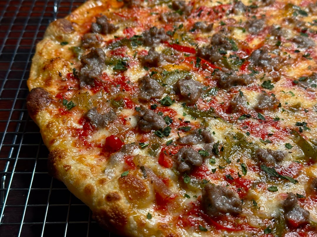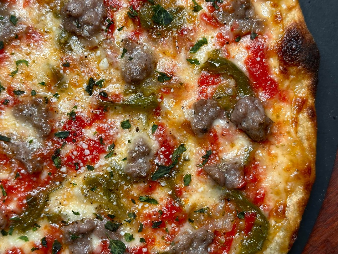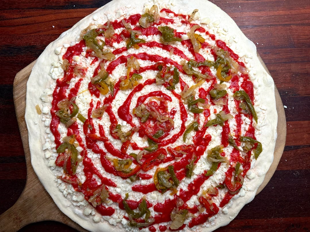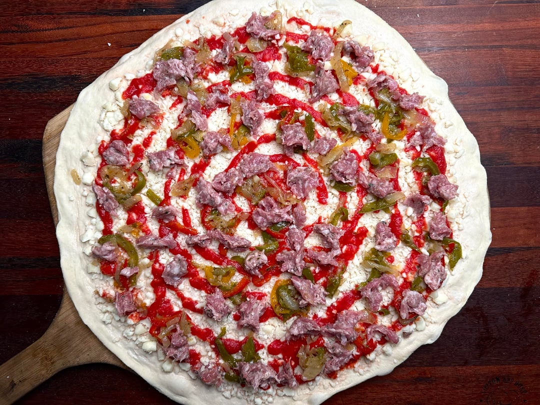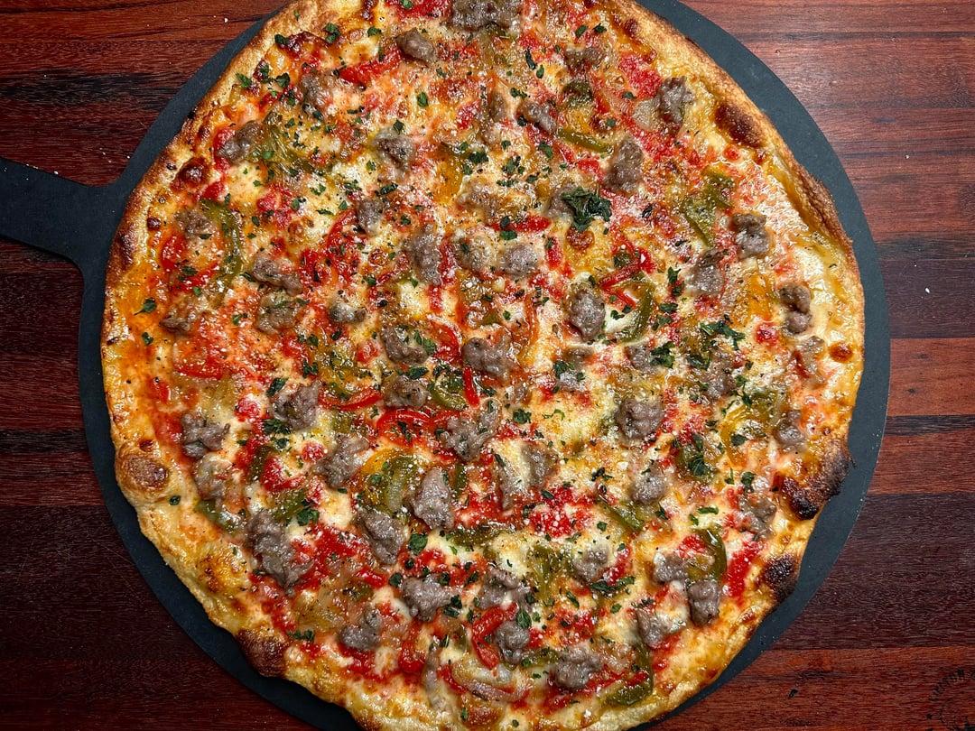 Pizza night! This week’s special was my take on a classic. Mozzarella and Scamorza mix, grated Pecorino Romano, homemade sweet Italian sausage, and sautéed peppers and onions with garlic and Marsala. by No_Pattern3088 Food