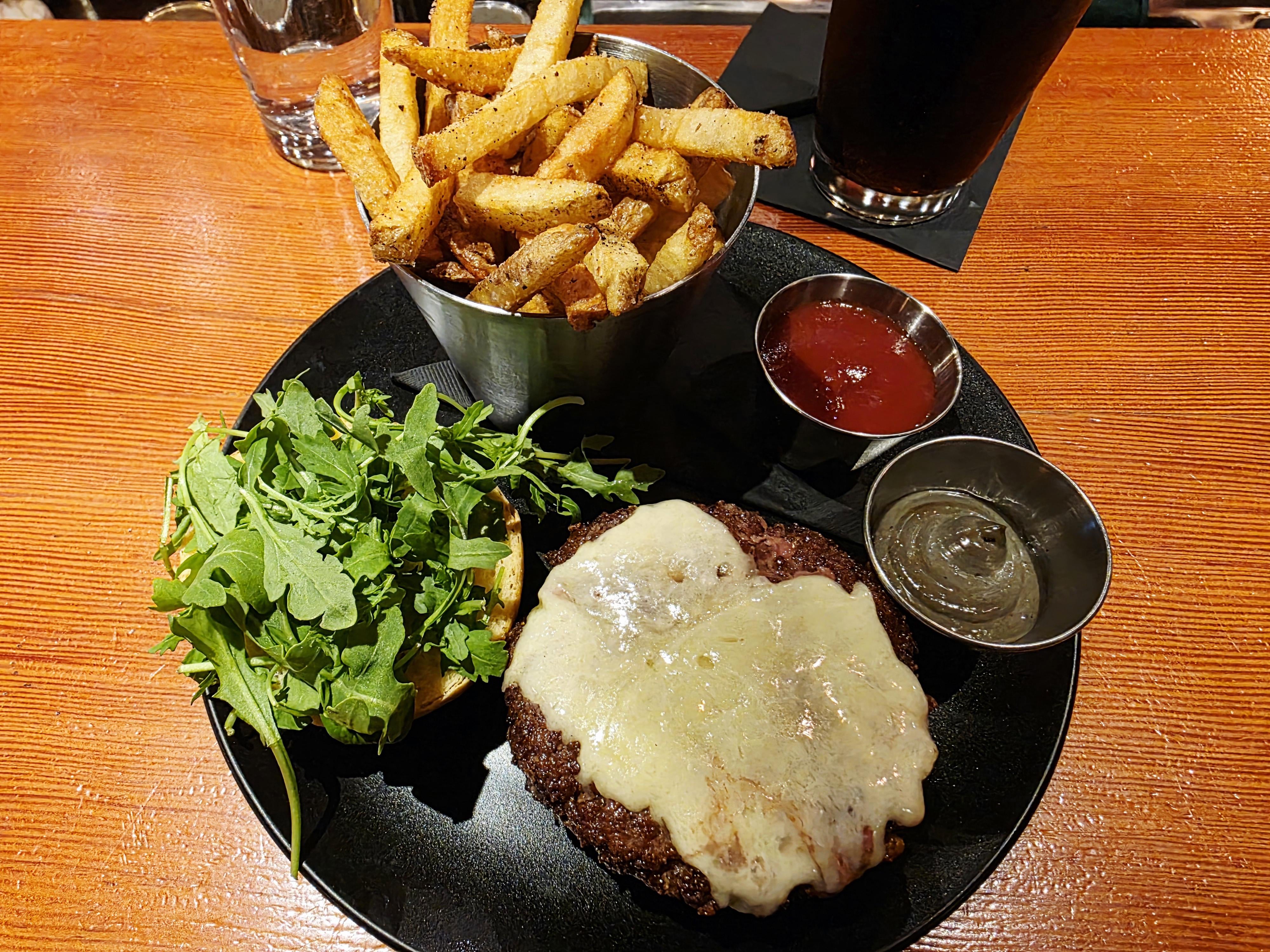 At my friend's restaurant. In house ground chuck, plus bun, black garlic aioli, and ketchup all made in house. I didn't get a picture, but it sad cooked perfectly pink inside. Is it the best burger I've ever had? Not quite. But it was damn good. The fries were fantastic as well.