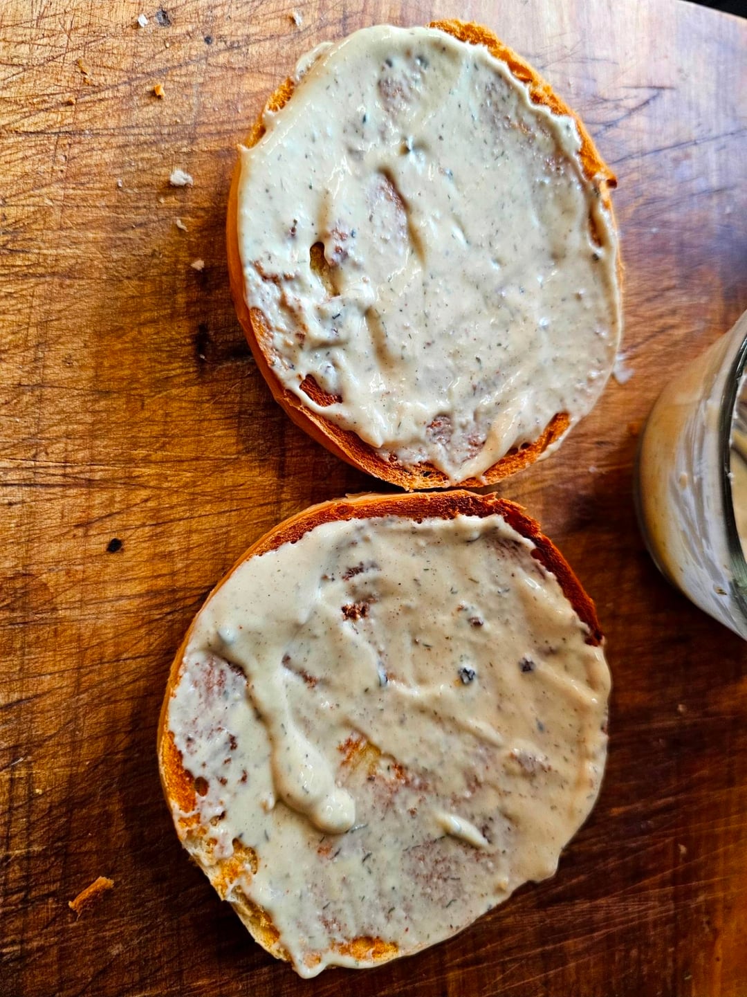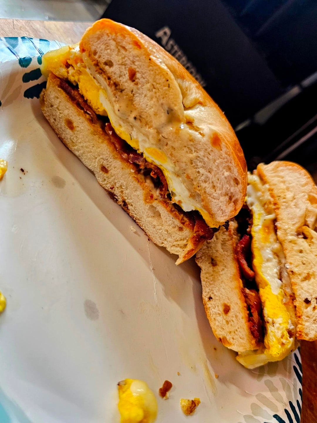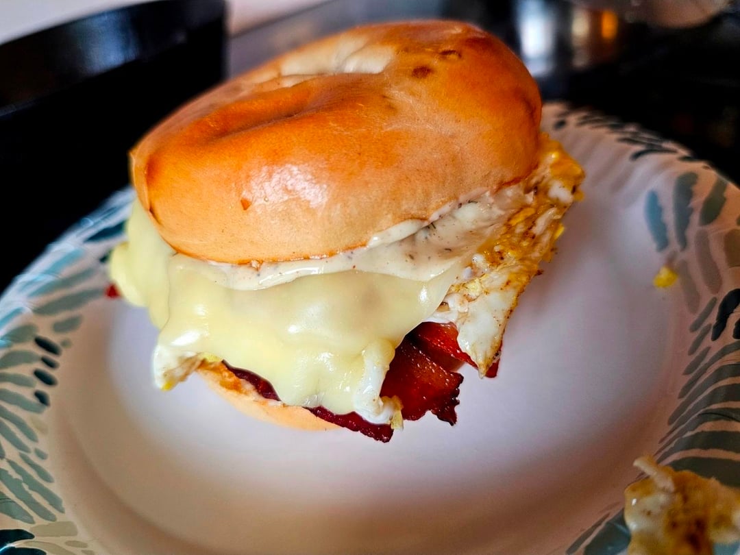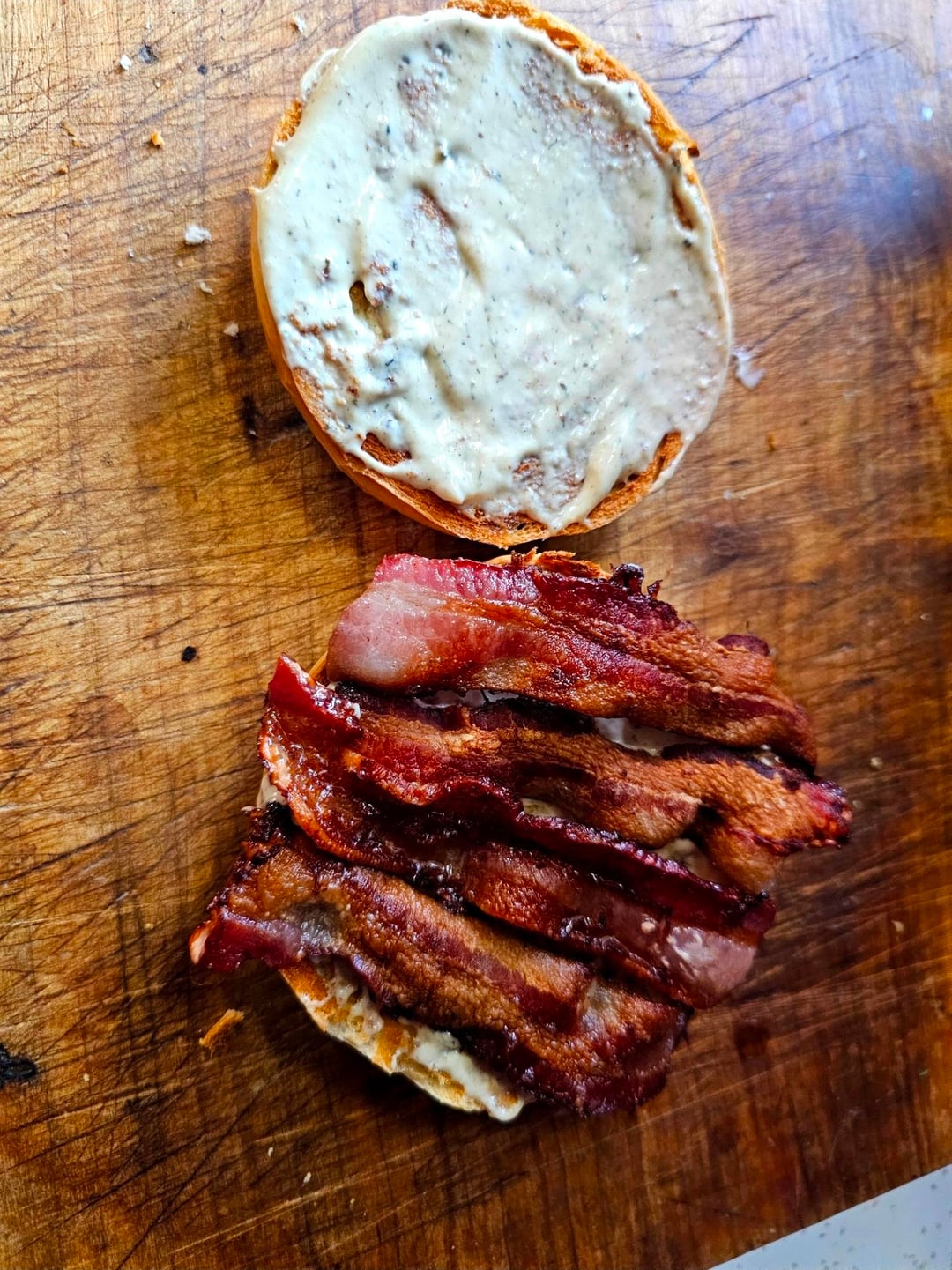 Quick B/E/C Bagel 😁 while cooking the bacon and toasting a bagel mix some mayo, pickle juice, lemon juice, worcestershire sauce, dijon mustard, onion powder, garlic powder, and pepper to taste…I don't bother adding salt since bacon is already salty…mix it up and adjust to taste. By now, the bacon should be crispy and the bagel toasted, spread your sauce, add the bacon, then fry a couple eggs in the bacon fat. Add a slice of cheese and enjoy!