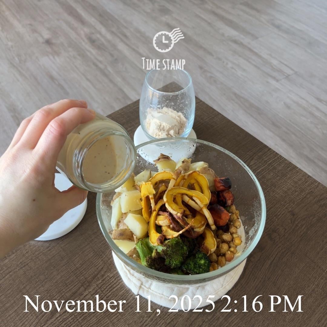 Roasted potato, broccoli, chickpea, delicatta squash, and carrots with a homemade tahini/yogurt/syrup/garlicky dressing and pea-protein powder (yes, I add water lol)