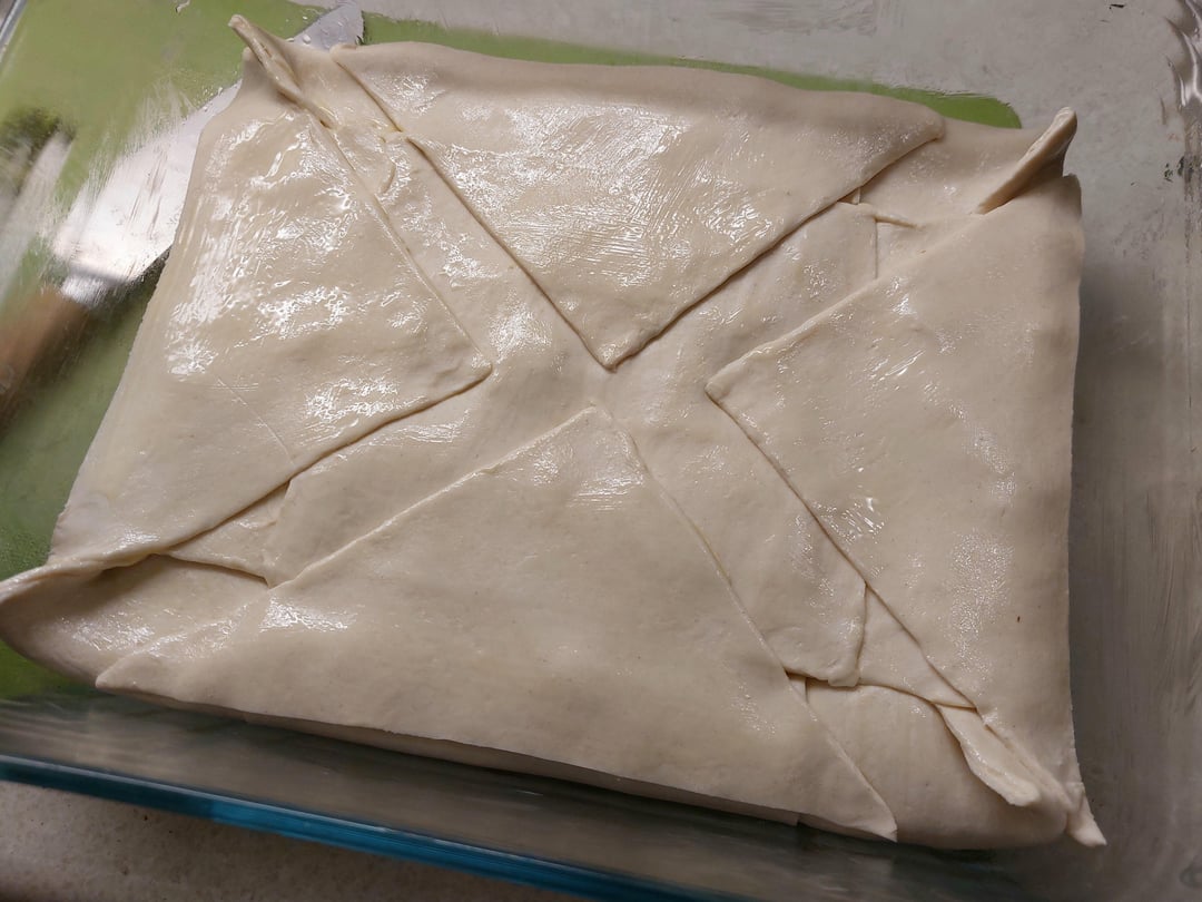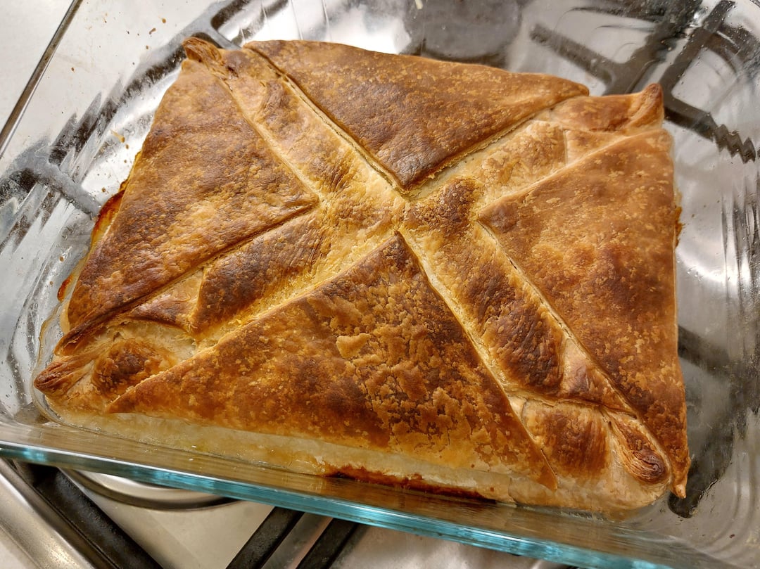 Fill the oven dish with puff pasty add the mixture of the ingredients, bake for 60 min at 200 degrees celcius