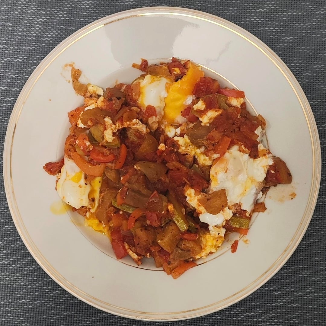 Dinner: …I know the picture is a bit nebulous, but this is, in fact, a "ratatouille" style dish with 2 eggs and some feta cheese (459k)