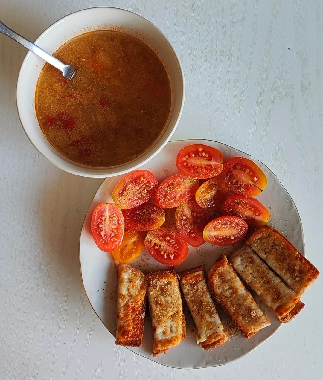 Lunch: Veggie soup (100~k), Cheese toast + tomatoes (260k)