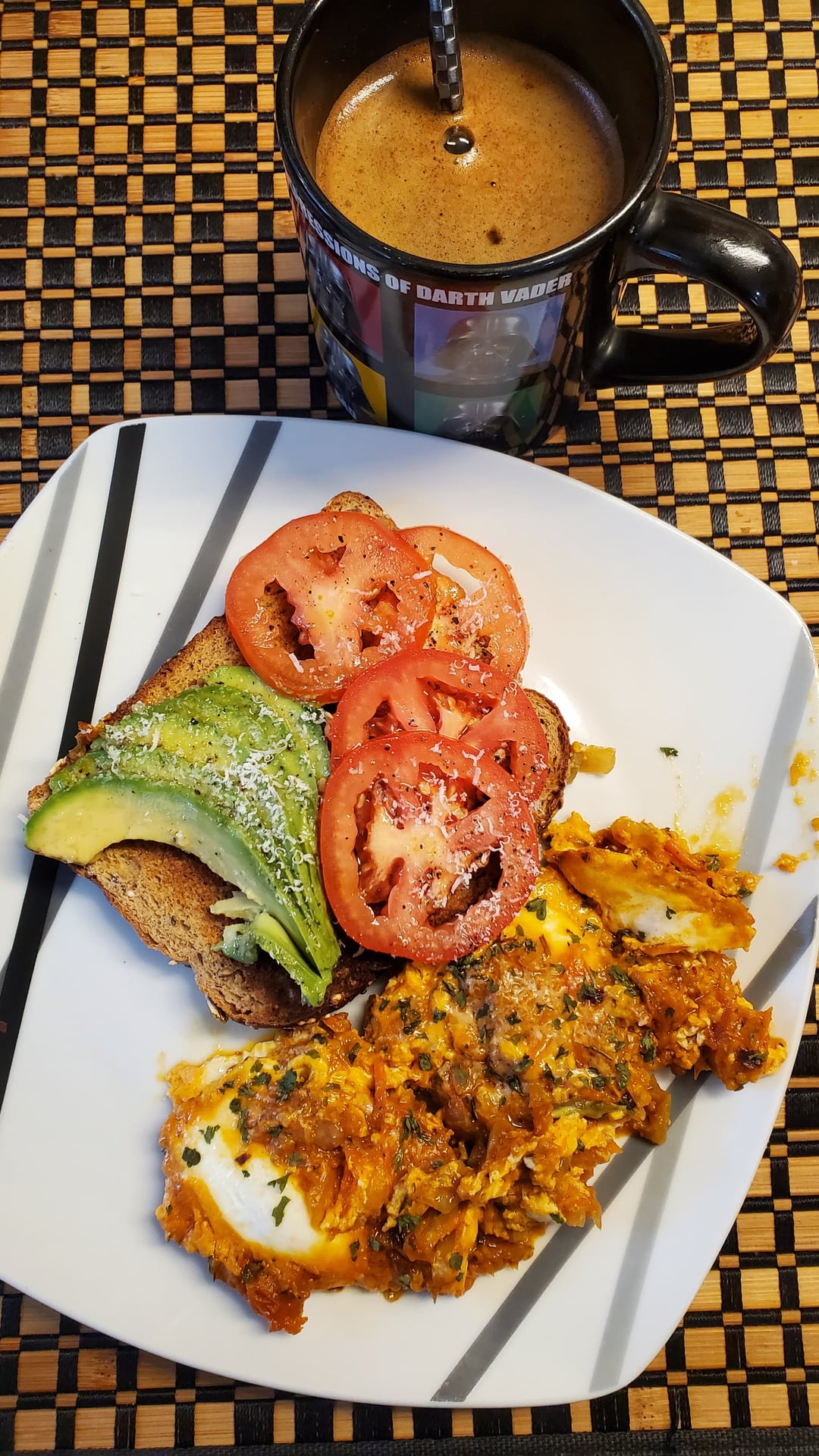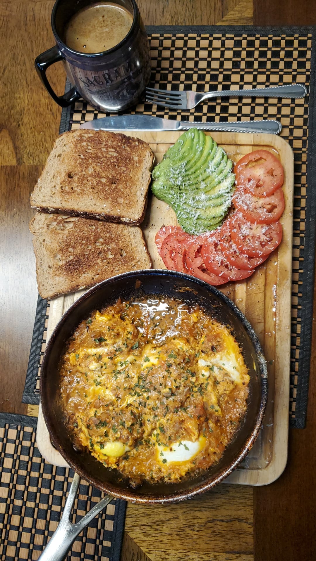 [Homemade] Rustic Tomato Shakshuka with firm eggs and whole grain toast